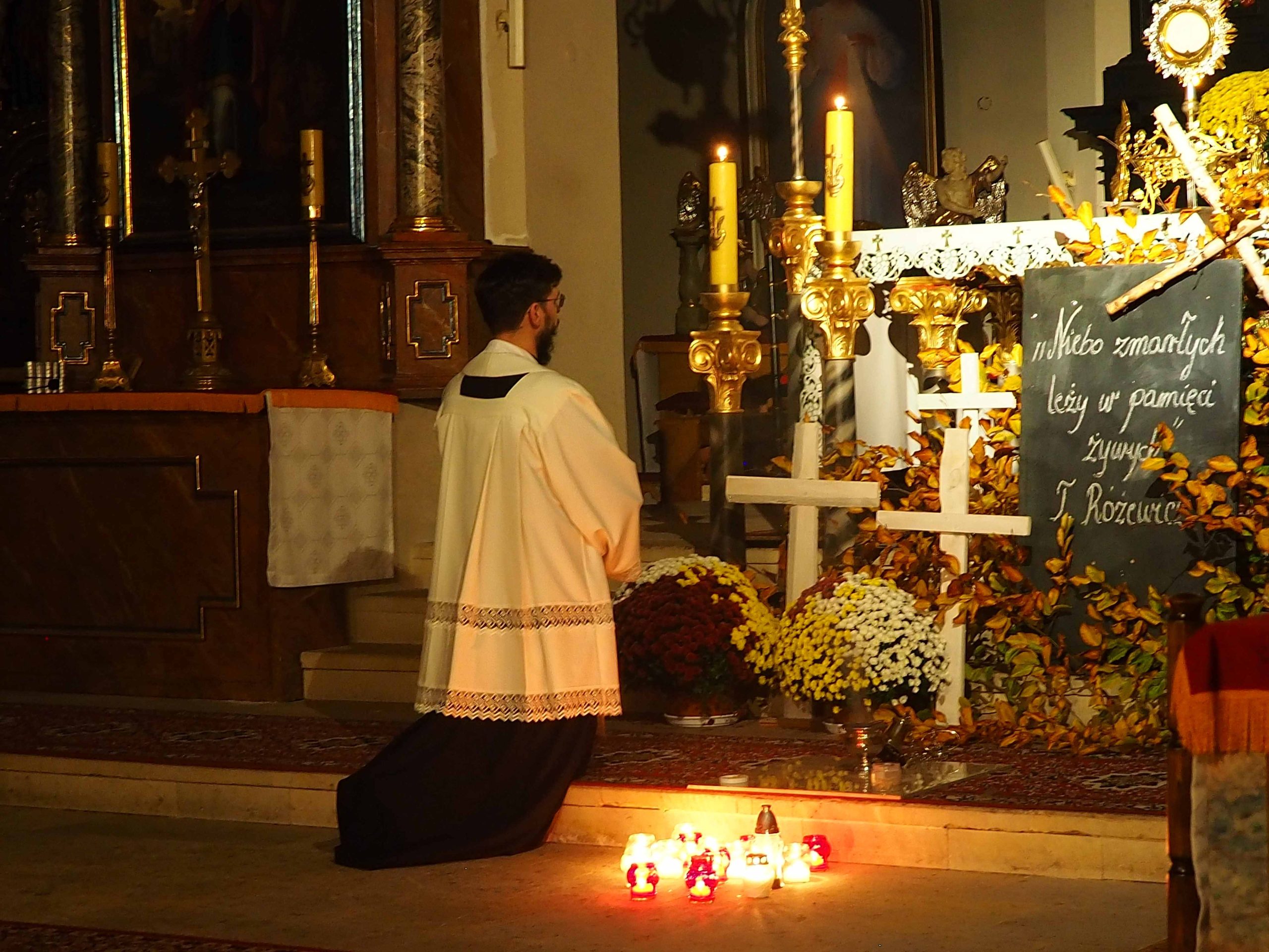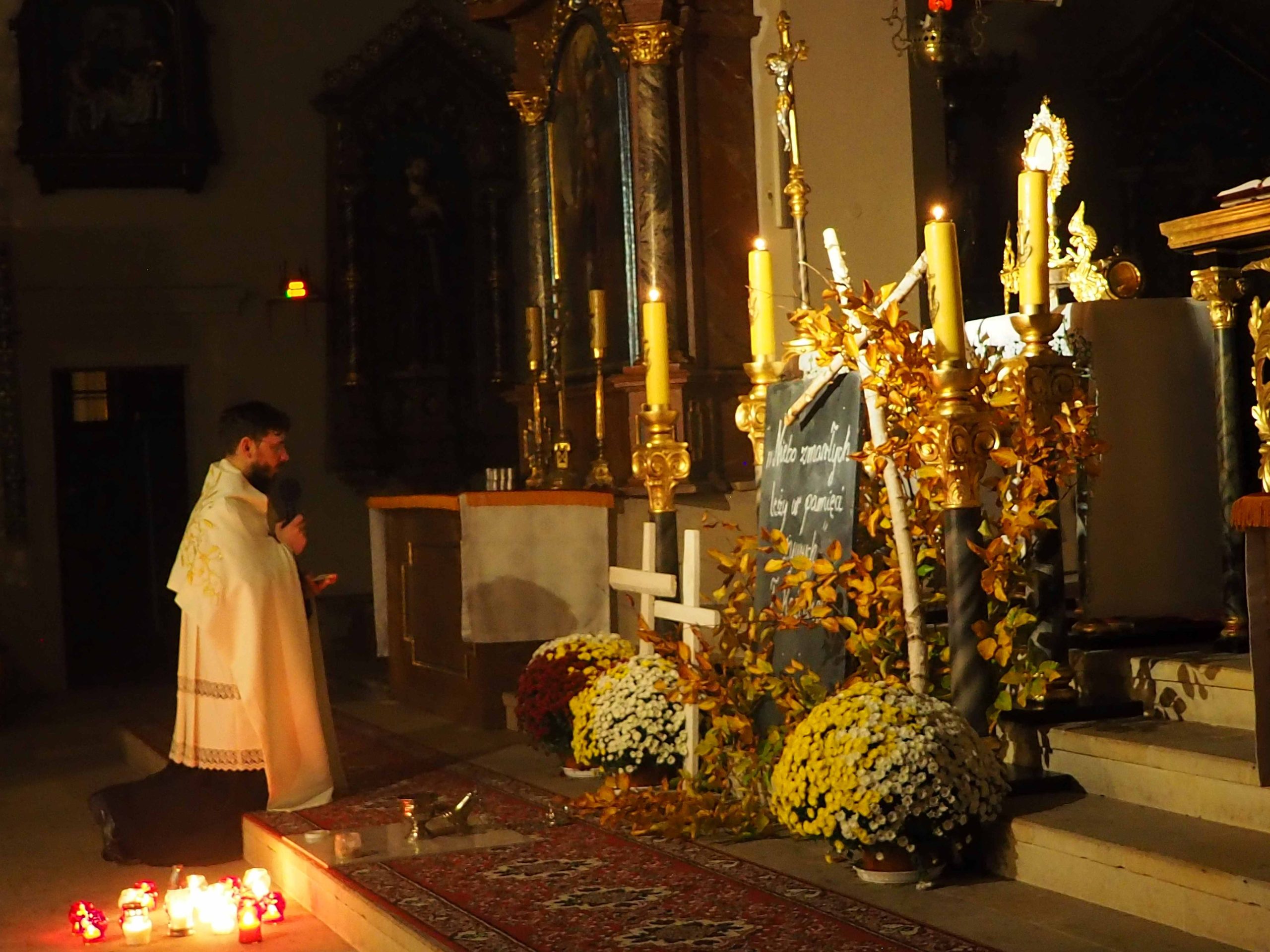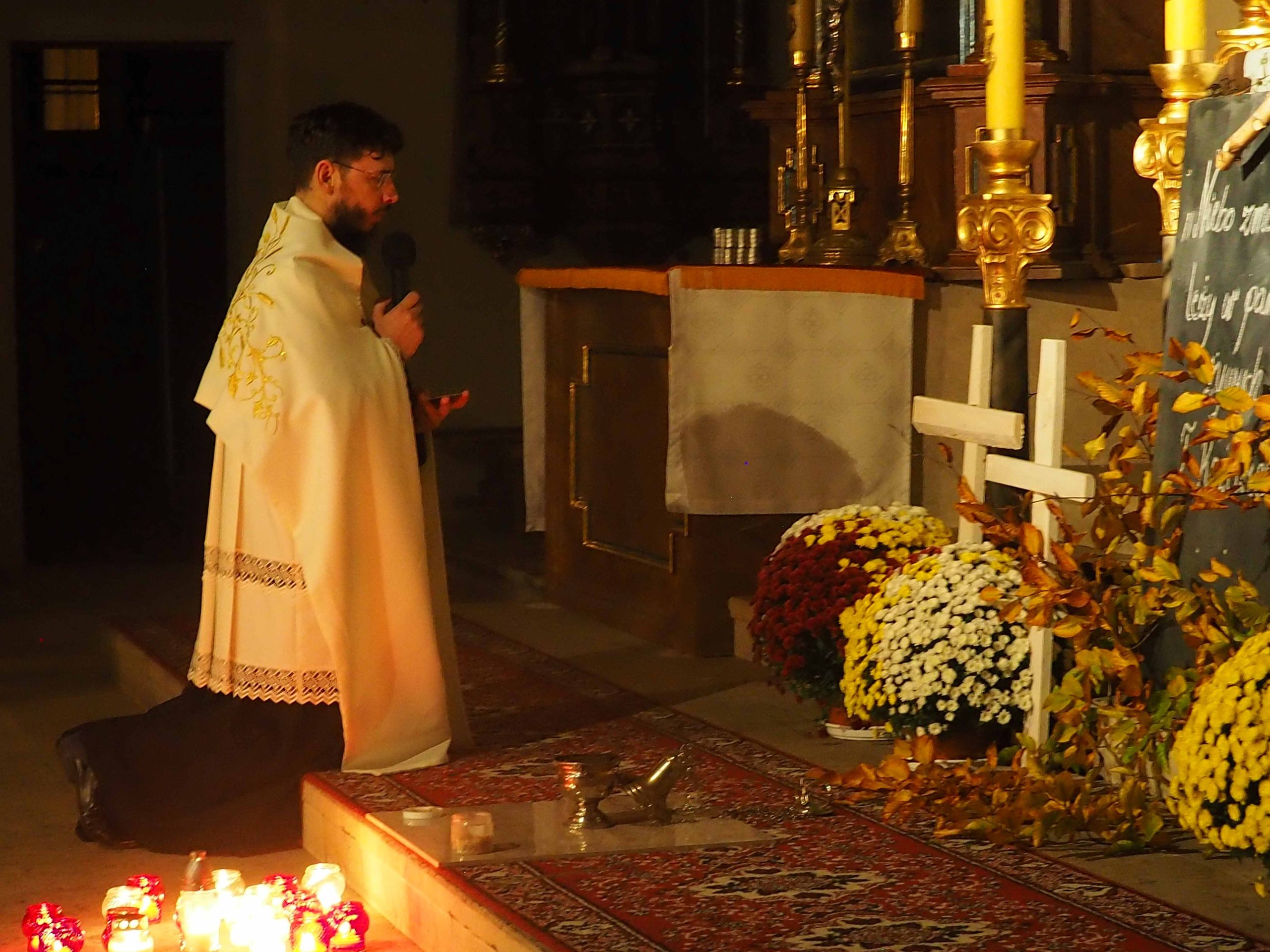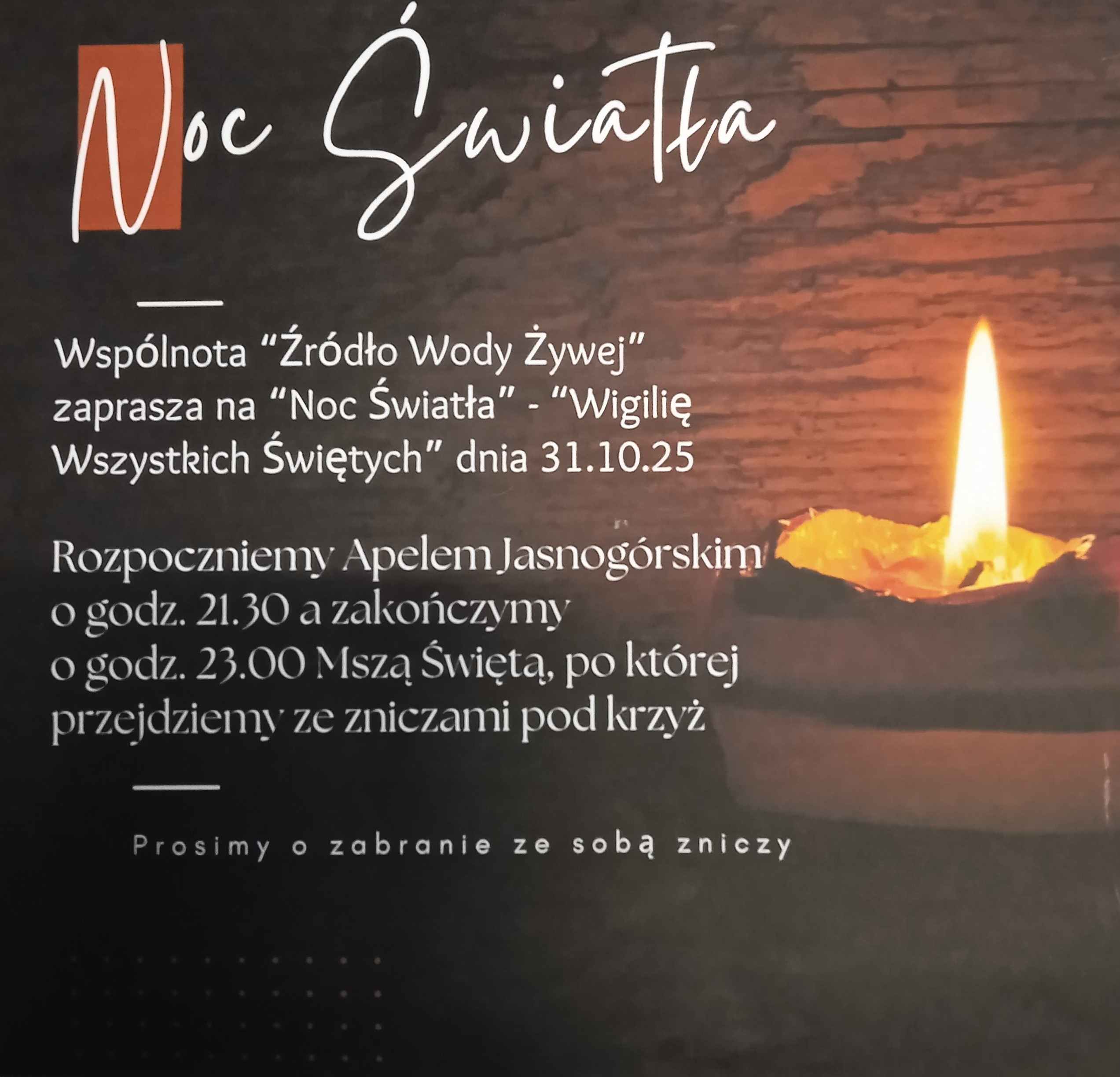 31 października 2025 roku od godz. 21:30 przeżywaliśmy NOC ŚWIATŁA przed uroczystością Wszystkich Świętych. Spotkanie modlitewne rozpoczęło się odśpiewaniem Apelu Jasnogórskiego. Następnie ks. Krzysztof powitał wszystkich jednocześnie zawiązując wspólnotę wiernych zgromadzonych na modlitwie. Potem członkowie wspólnoty Źródła Wody Żywej prowadzili modlitwę uwielbienia z zaproszeniem naszych świętych patronów. Odśpiewana została Litania do Wszystkich Świętych. Po wygłoszonym komentarzu dotyczącym symboliki światła i kadzidła został wystawiony Najświętszy Sakrament. Nastąpiła wtedy modlitwa uwielbienia z jednoczesnym indywidualnym zaniesieniem żywego światła (znicza) i dosypywaniem ziaren kadziła przez wiernych przed Najświętszy Sakrament. Zwieńczeniem Nocy Światła była Eucharystia celebrowana przez ks. Krzysztofa.