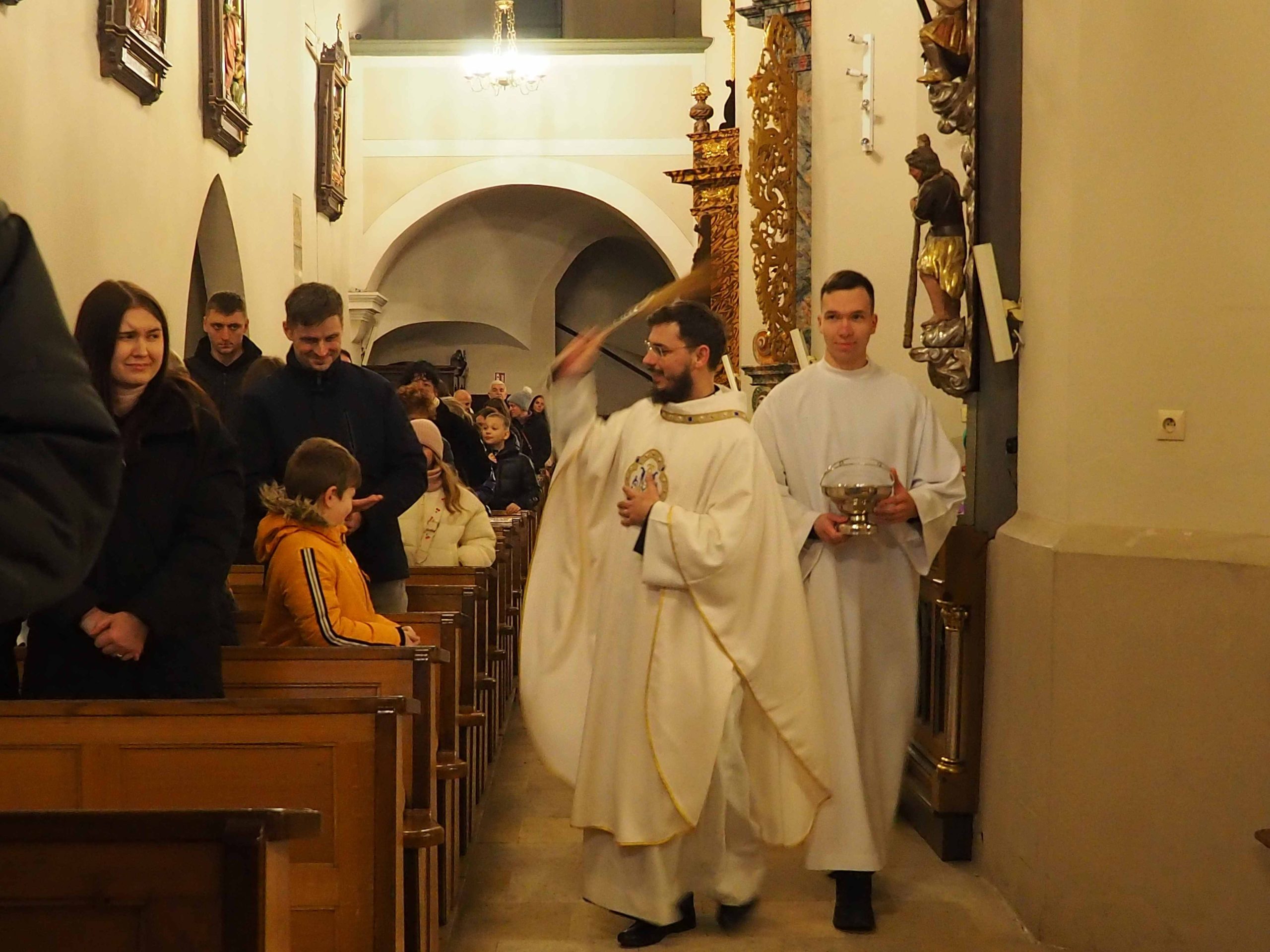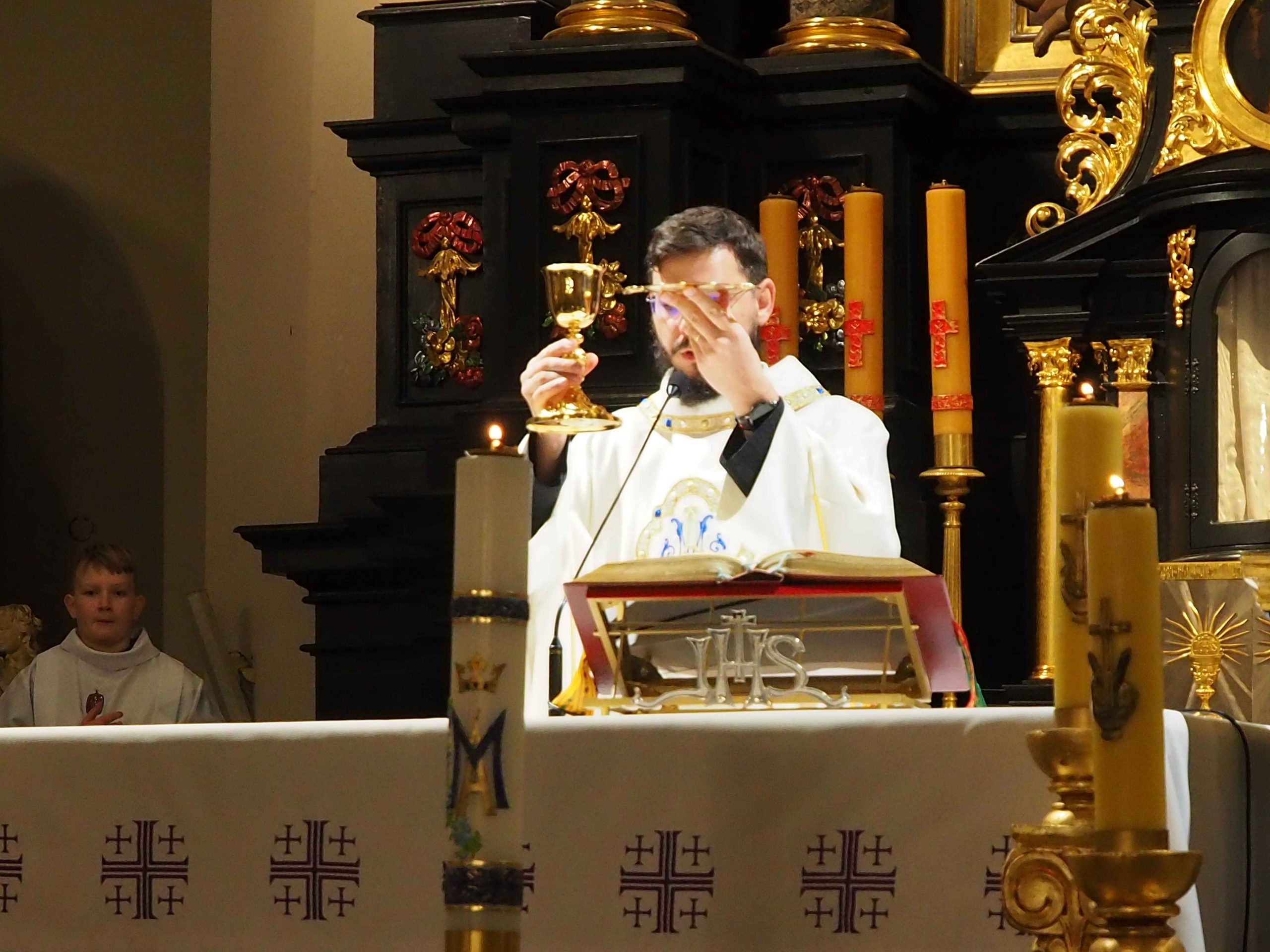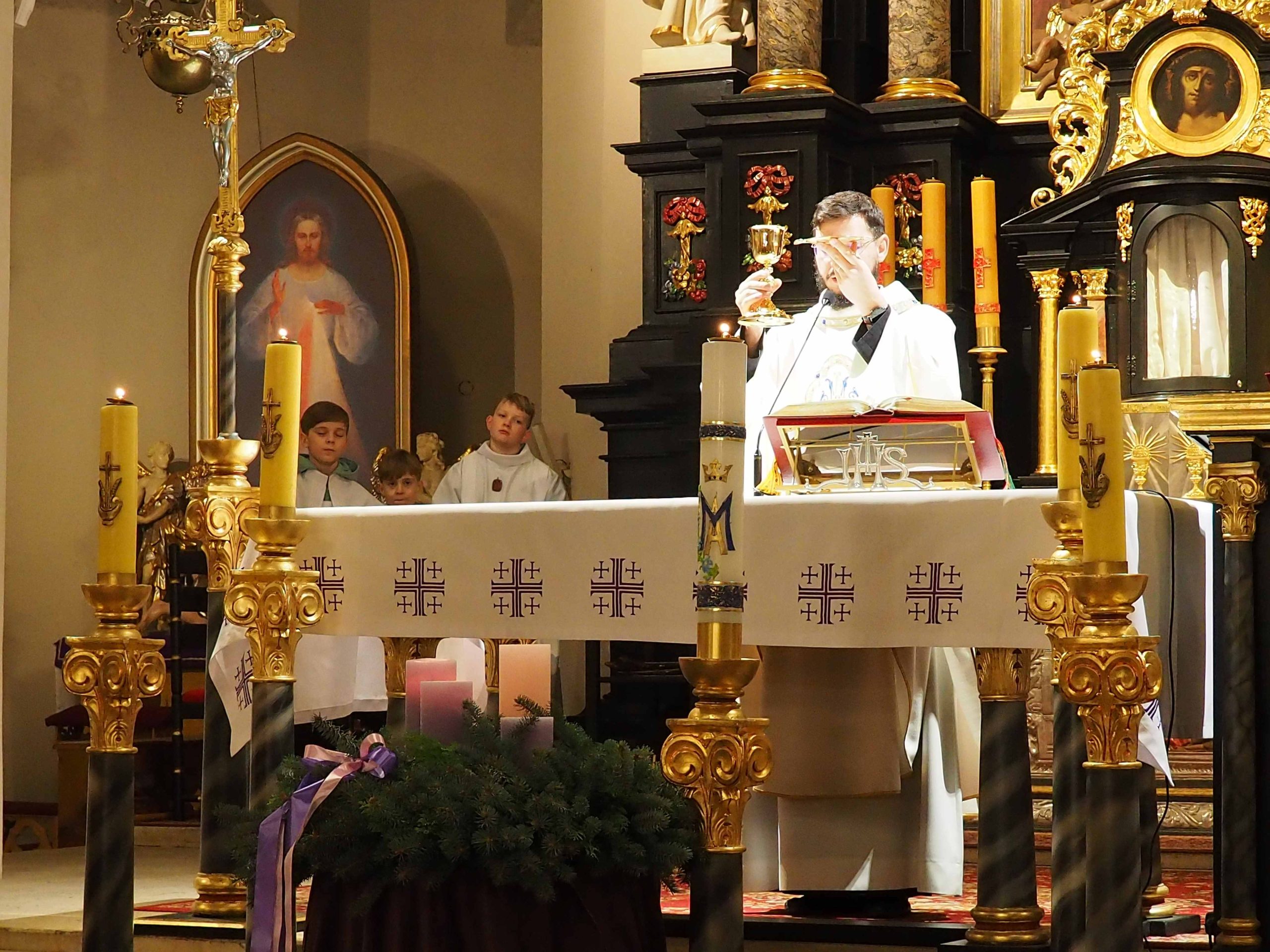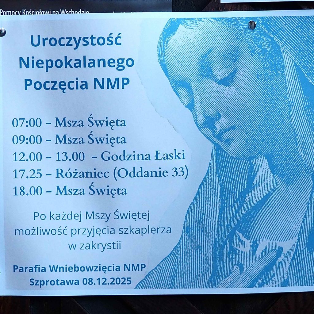 W poniedziałek 8 grudnia 2025 przypada uroczystość Niepokalanego Poczęcia NMP. W tym uroczystym dniu Msze św. odprawione zostały o godz. 7:00; 9:00; i 18:00. Godzina Łaski, która trwała w godz. 12:00 – 13:00 została prowadzona przez „Apostolstwo dobrej śmierci” i „Krąg biblijny”, który modlił się wraz z wiernymi modlitwą różańcową przed wystawionym Najświętszym Sakramentem. Modlitwa różańcowa prowadzona była także przez członków grupy modlitewnej „Oddanie 33” o godz. 17:30. Na Mszy Św. o godz. 18:00 odbyło się błogosławieństwo medalików dzieci przygotowujących się do I Komunii Świętej oraz został pobłogosławiony ornat i bielizna ołtarzowa, która została ofiarowana przez członków grupy modlitewnej „Oddanie 33”. Po każdej Eucharystii można było poświęcić i przyjąć szkaplerz karmelitański.