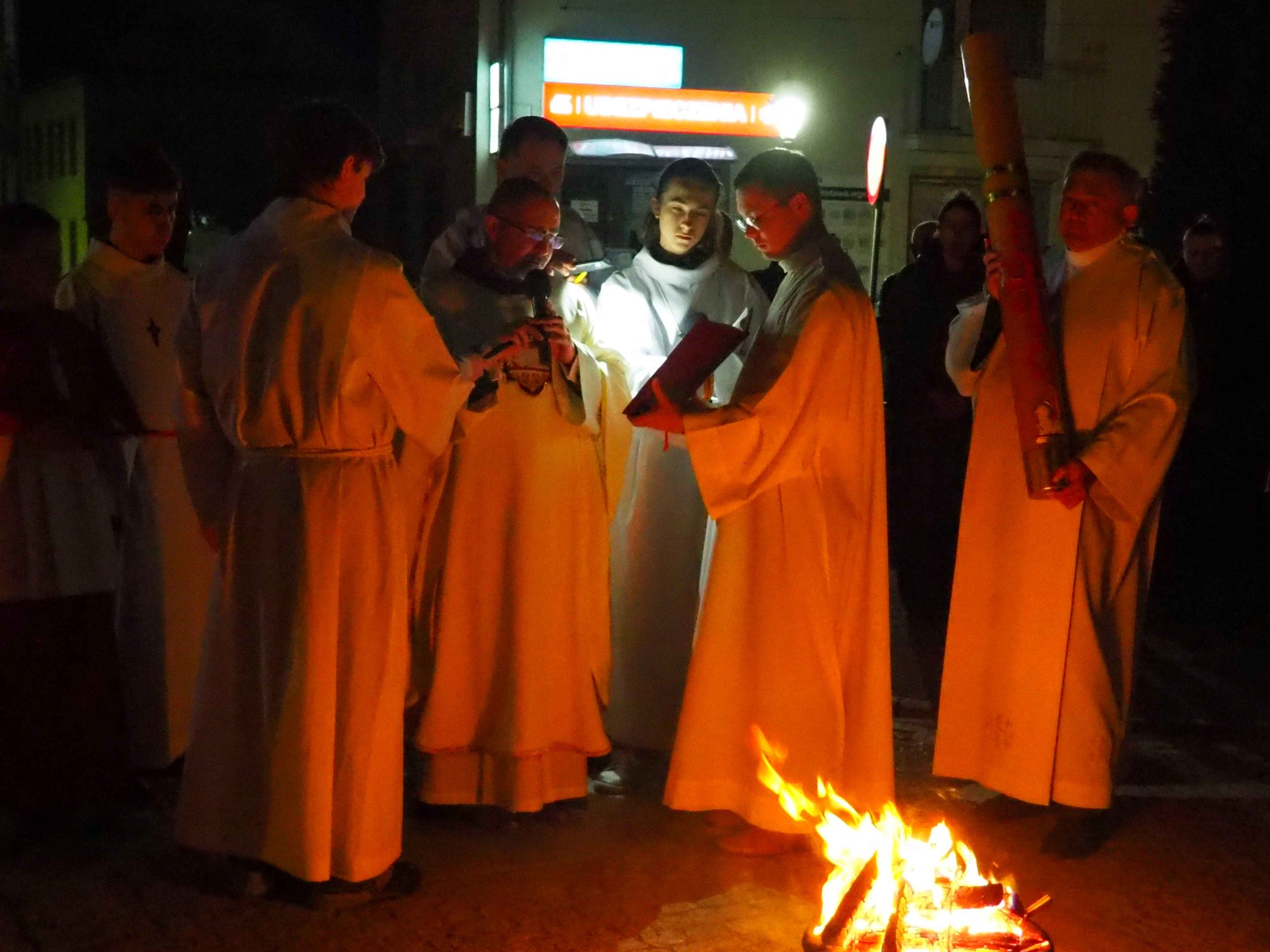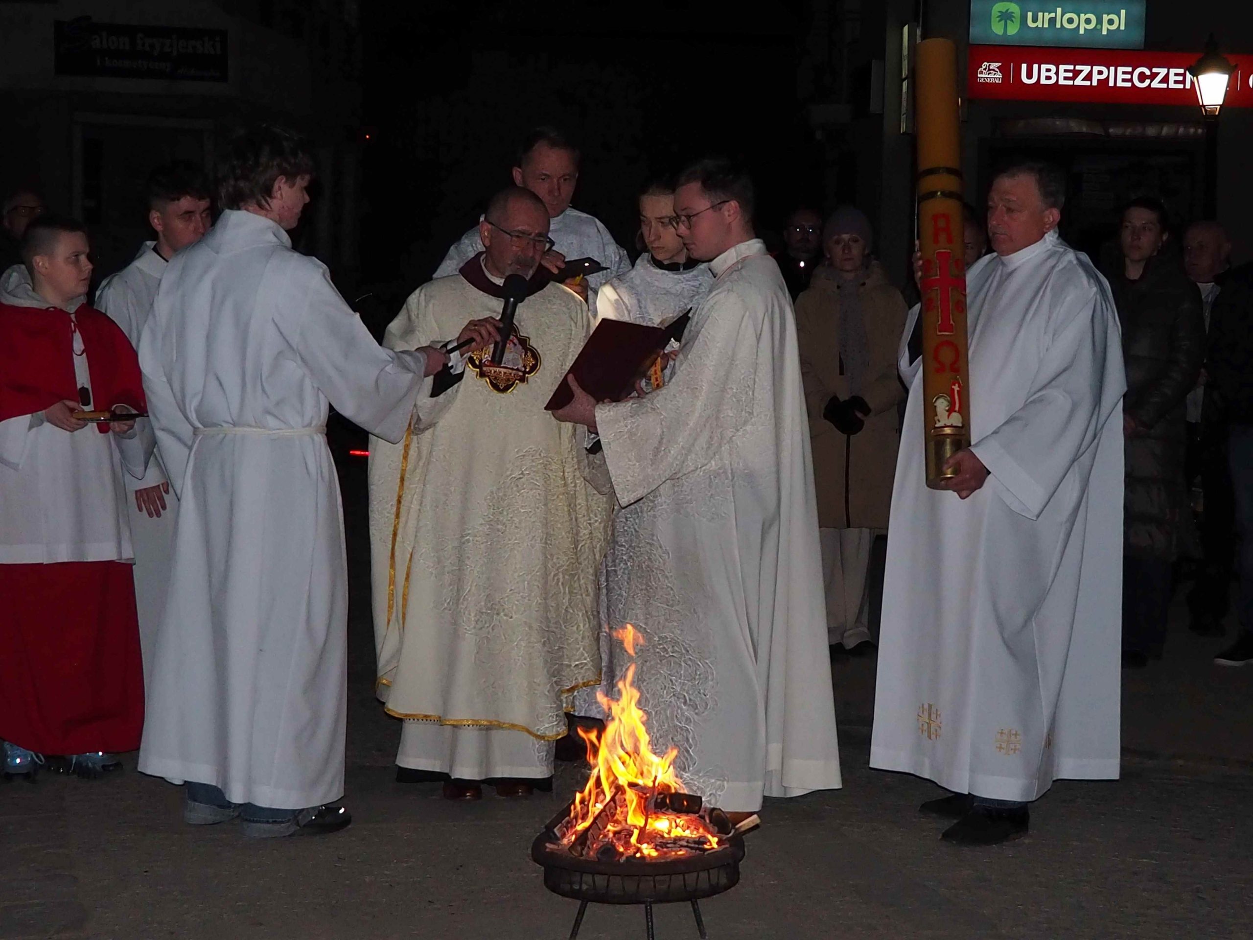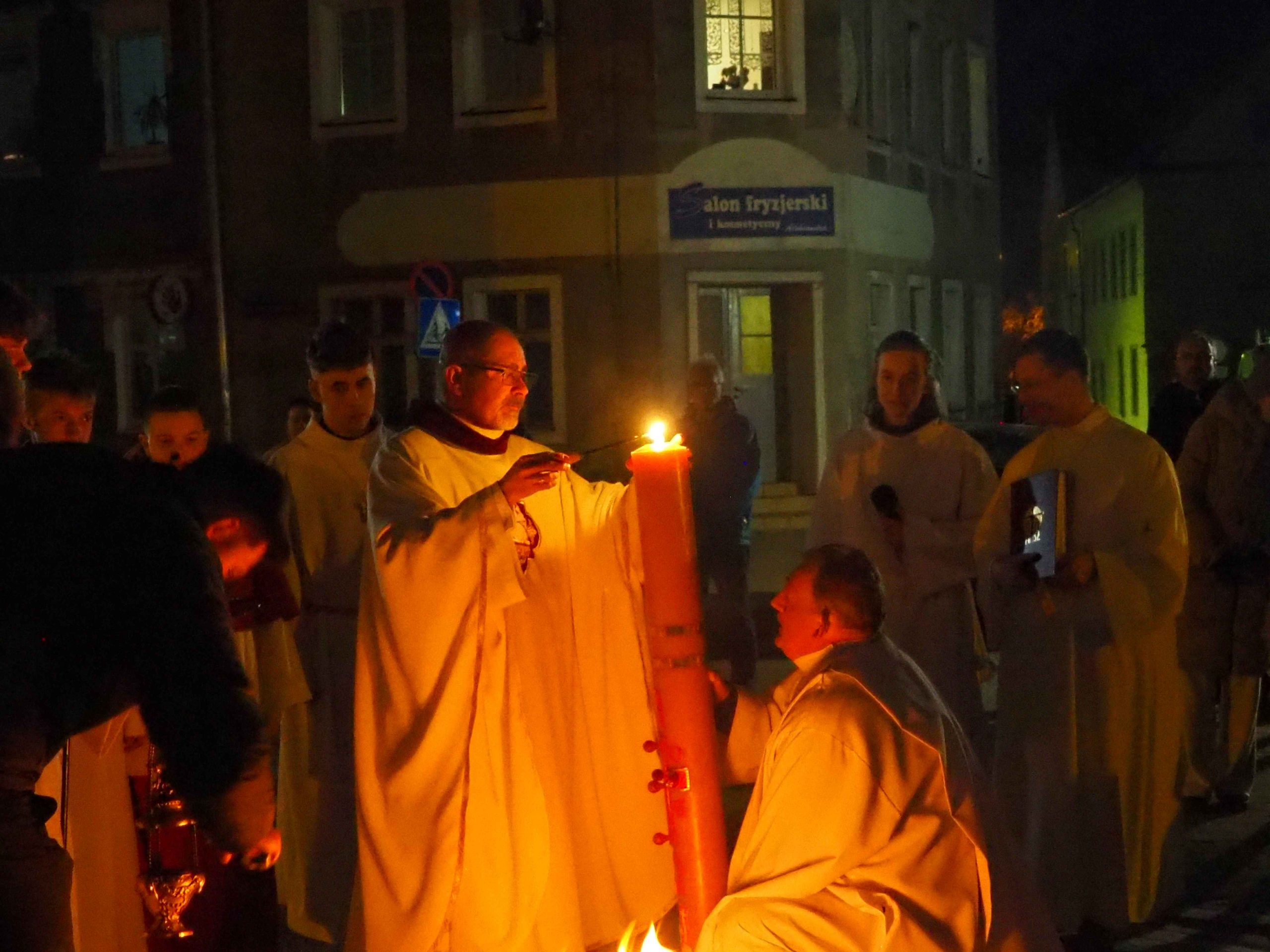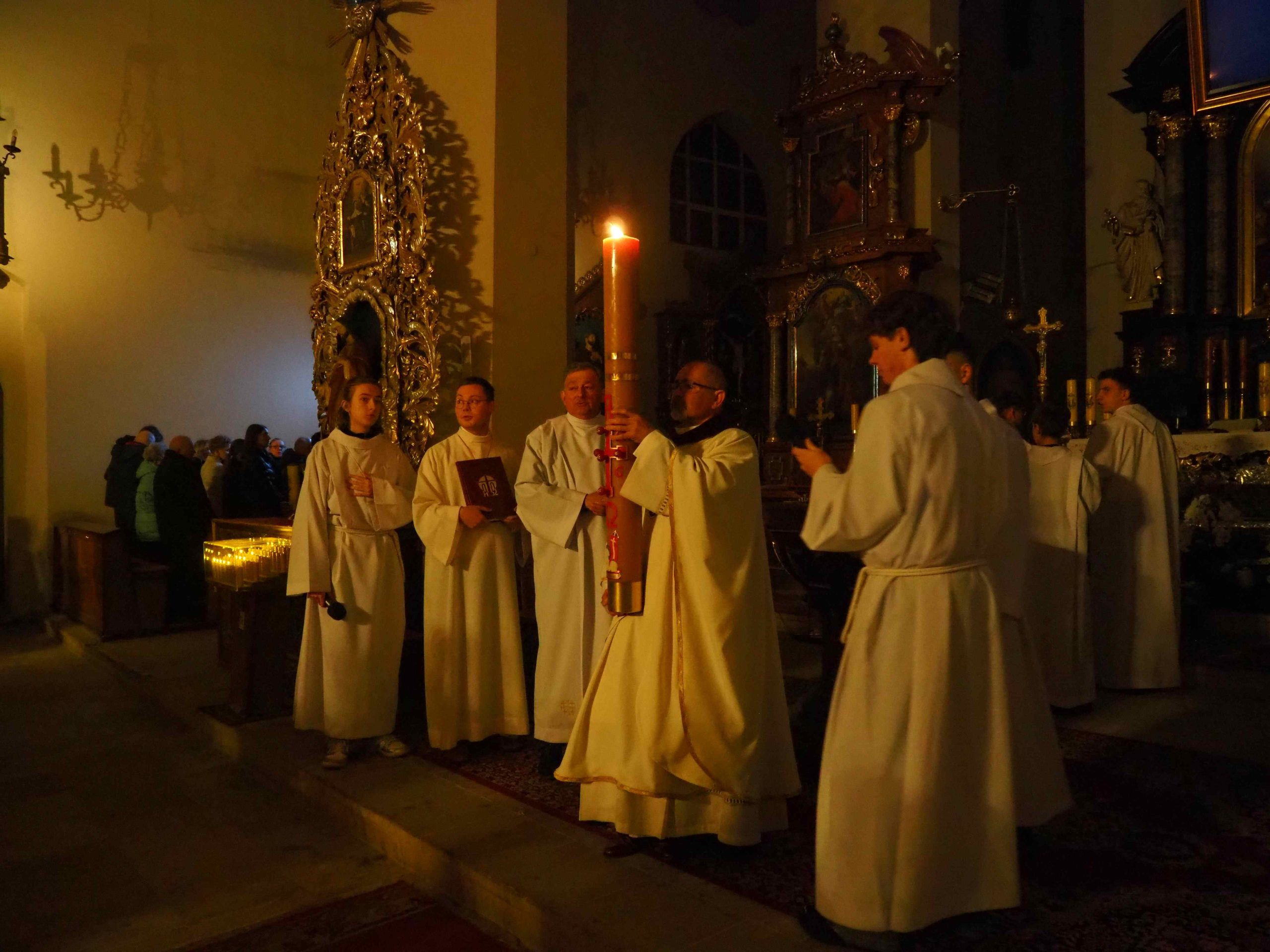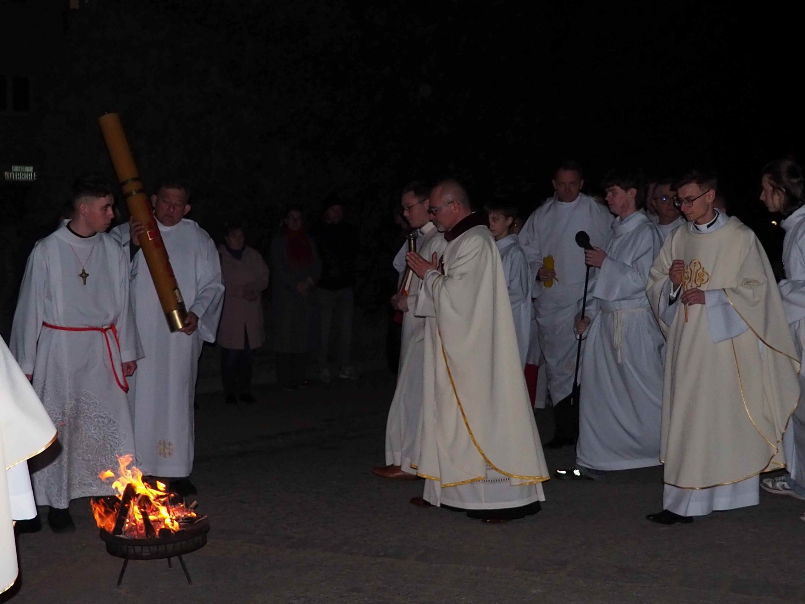 Poświęcony został ogień, od którego zapalił paschał, potem zostały wyżłobione symbolicznie greckie litery Alfa i Omega (Bóg , który istnieje od zawsze i nie przestanie istnieć) oraz cyfry obecnego roku (oznaczają wpisanie naszej, konkretnej historii w nieskończone istnienie Boga) i wbite zostały w paschał symboliczne grona oznaczające 5 ran Chrystusa-Boga. Po zapaleniu paschału celebrans nałożył kadzidło do kadzielnicy. W tym czasie w kościele była zupełna ciemność. Celebrans wchodząc procesyjnie do kościoła trzykrotnie zatrzymywał się śpiewając wezwanie „Światło Chrystusa” i zostawały zapalane świece od paschału. Paschał został wniesiony przed ołtarz i rozpoczęła się liturgia w kościele. Ks. Tomasz odśpiewał ORĘDZIE WIELKANOCNE (Exsultet). Podczas Liturgii Słowa wysłuchaliśmy 8 czytań (7 ze Starego Testamentu i 1 z Nowego Testamentu), przeplatane śpiewem psalmów i modlitwą celebransa. W tę część włączyły się osoby świeckie, nadzwyczajni szafarze i lektorzy. Usłyszeliśmy wreszcie radosne „Chwała na wysokości” wraz z głosami wszystkich dzwonów i dzwonków.