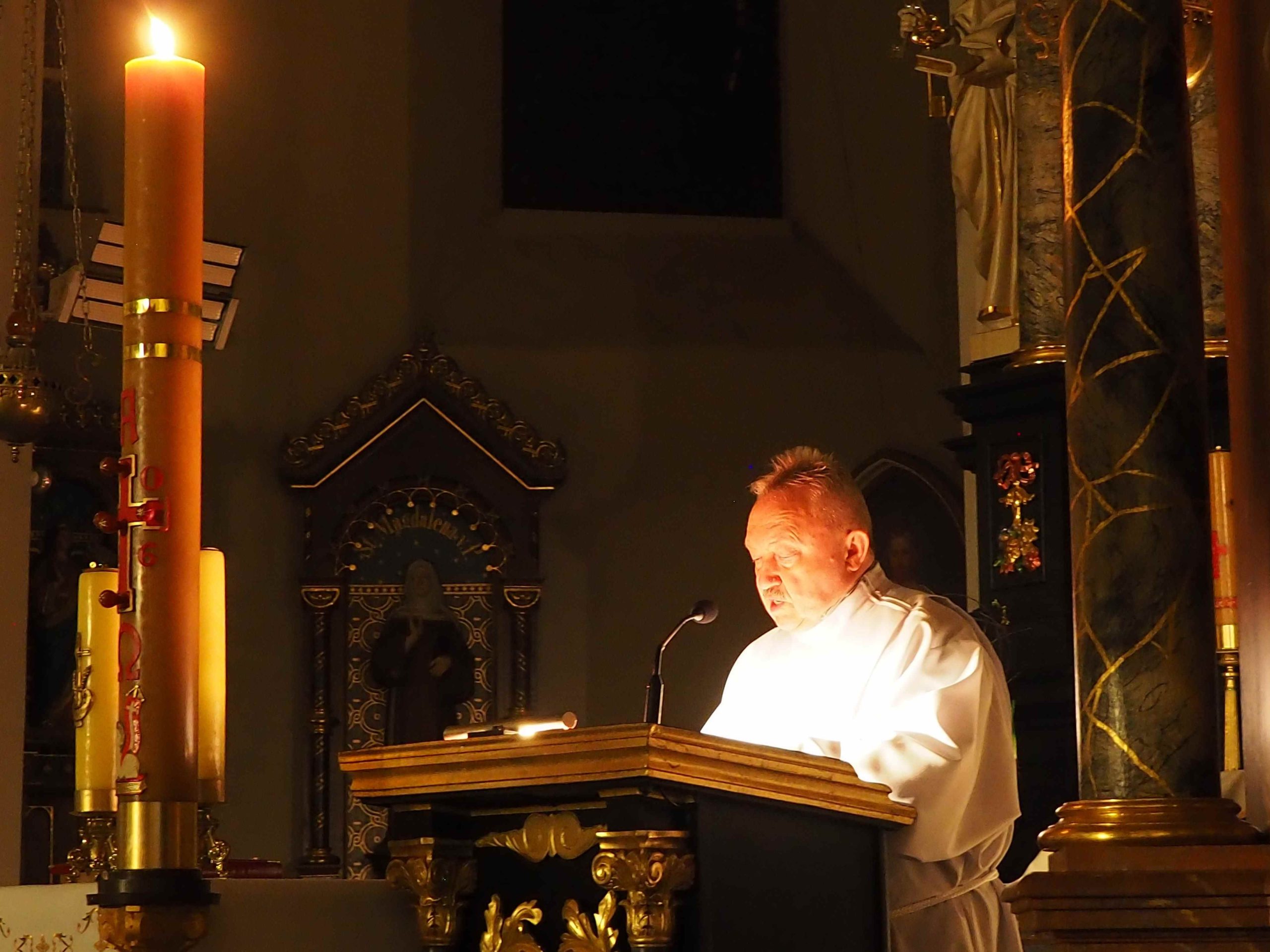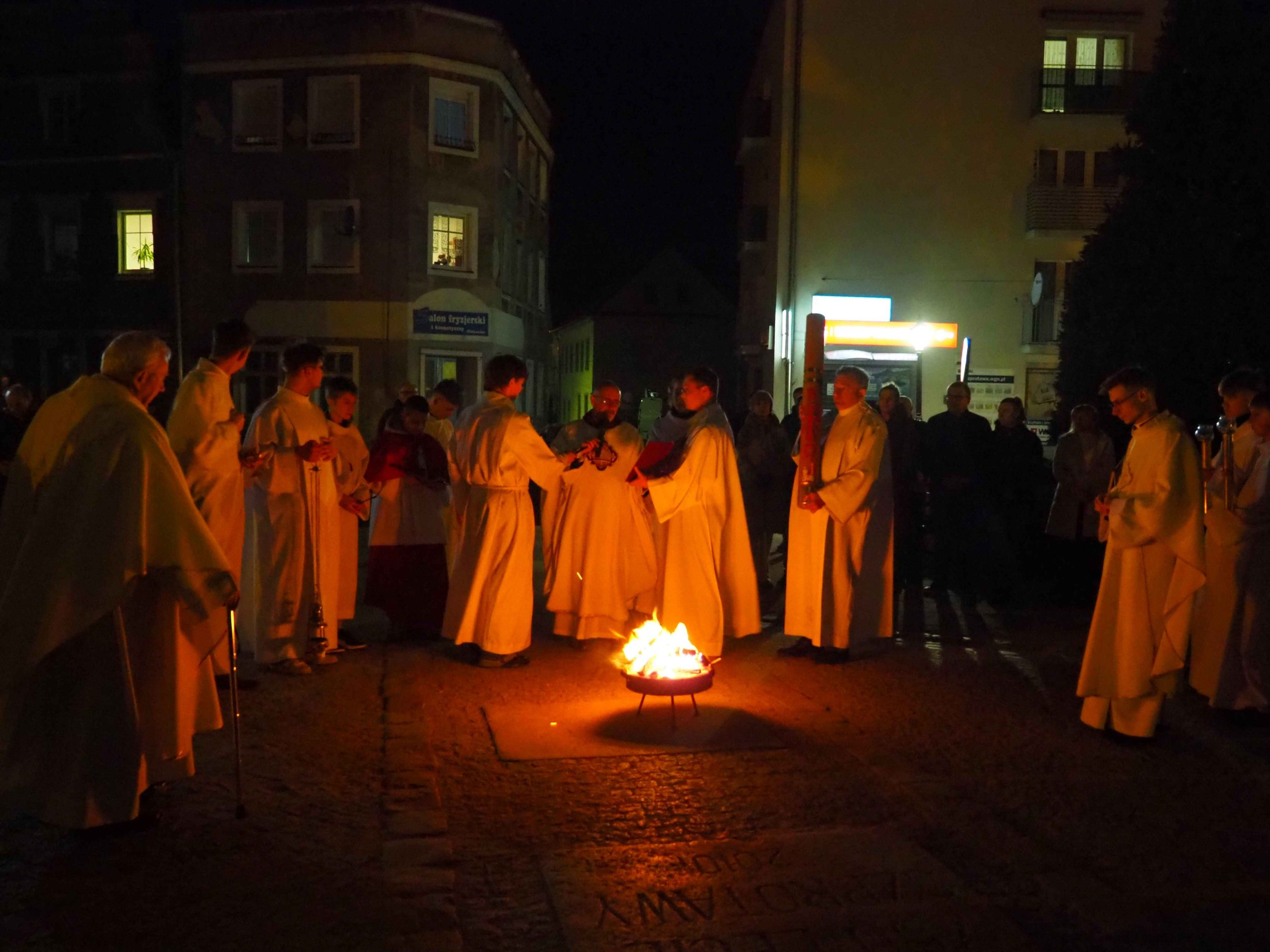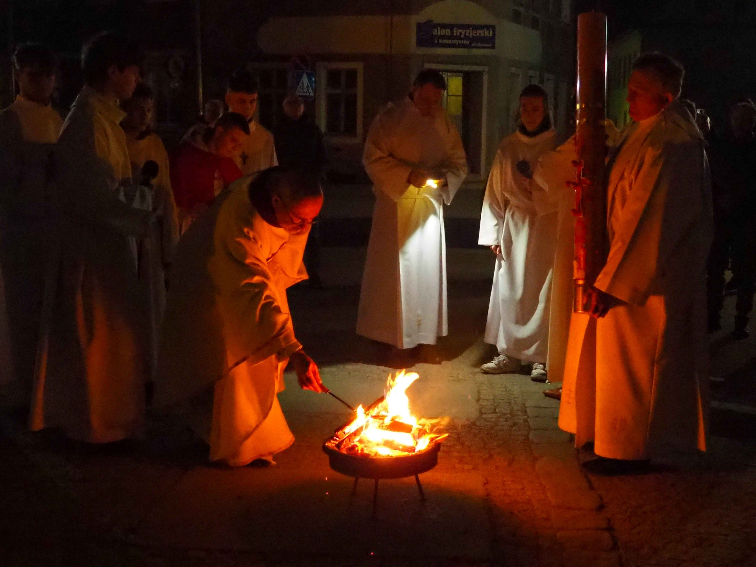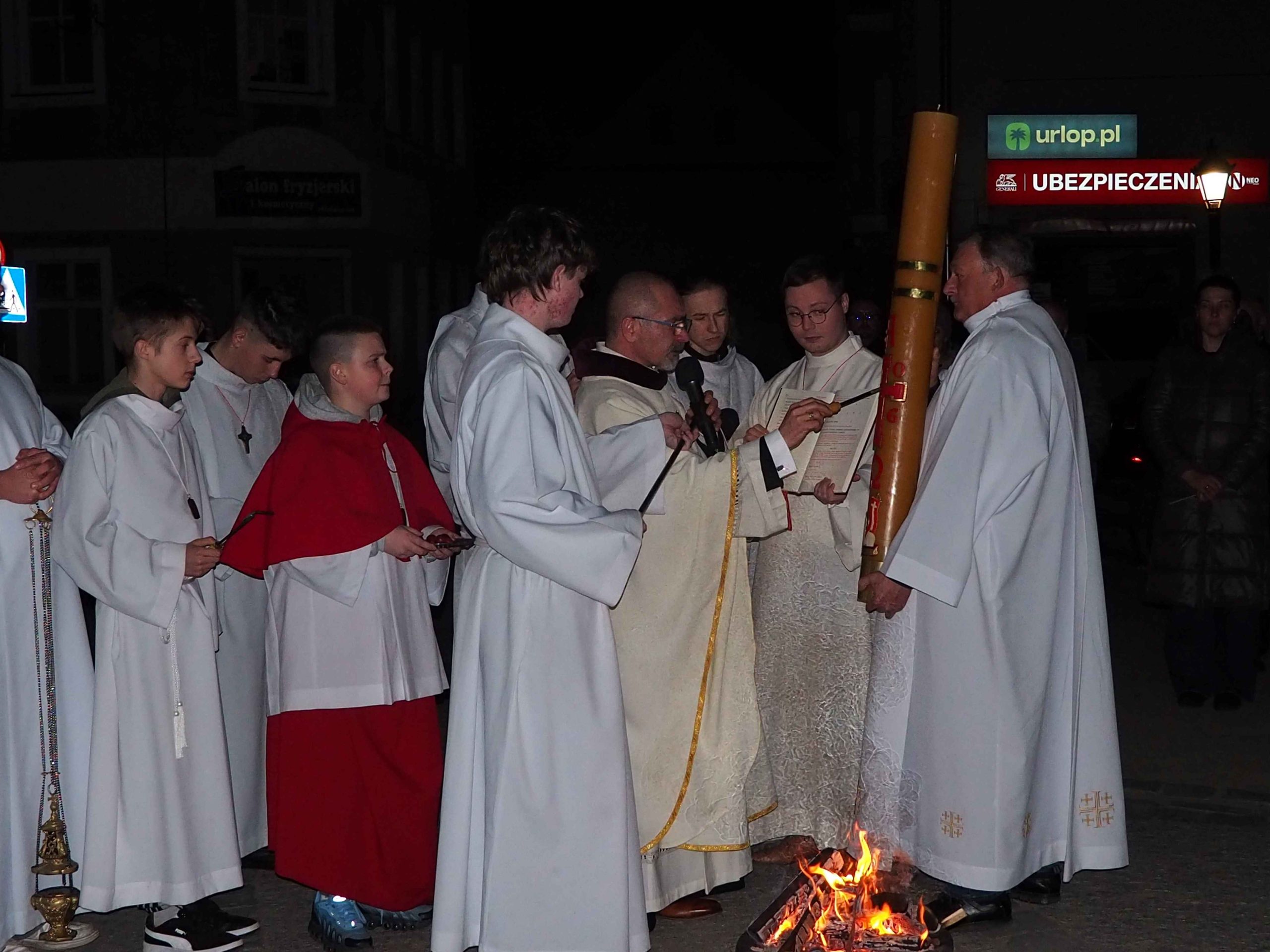 Poświęcony został ogień, od którego zapalił paschał, potem zostały wyżłobione symbolicznie greckie litery Alfa i Omega (Bóg , który istnieje od zawsze i nie przestanie istnieć) oraz cyfry obecnego roku (oznaczają wpisanie naszej, konkretnej historii w nieskończone istnienie Boga) i wbite zostały w paschał symboliczne grona oznaczające 5 ran Chrystusa-Boga. Po zapaleniu paschału celebrans nałożył kadzidło do kadzielnicy. W tym czasie w kościele była zupełna ciemność. Celebrans wchodząc procesyjnie do kościoła trzykrotnie zatrzymywał się śpiewając wezwanie „Światło Chrystusa” i zostawały zapalane świece od paschału. Paschał został wniesiony przed ołtarz i rozpoczęła się liturgia w kościele. Ks. Tomasz odśpiewał ORĘDZIE WIELKANOCNE (Exsultet). Podczas Liturgii Słowa wysłuchaliśmy 8 czytań (7 ze Starego Testamentu i 1 z Nowego Testamentu), przeplatane śpiewem psalmów i modlitwą celebransa. W tę część włączyły się osoby świeckie, nadzwyczajni szafarze i lektorzy. Usłyszeliśmy wreszcie radosne „Chwała na wysokości” wraz z głosami wszystkich dzwonów i dzwonków.