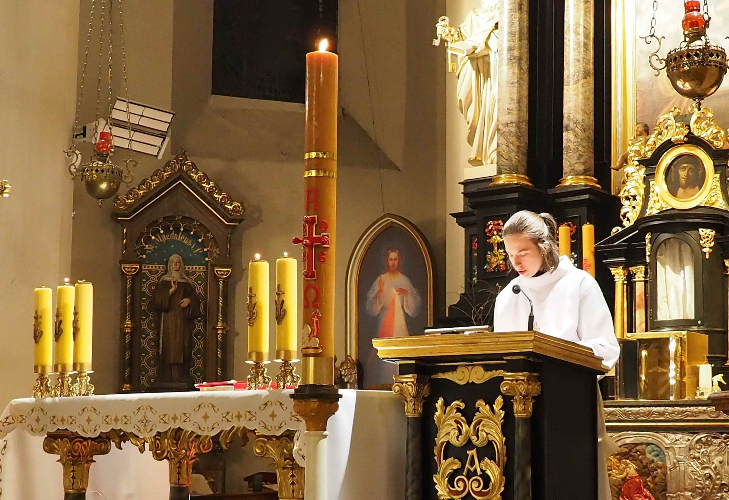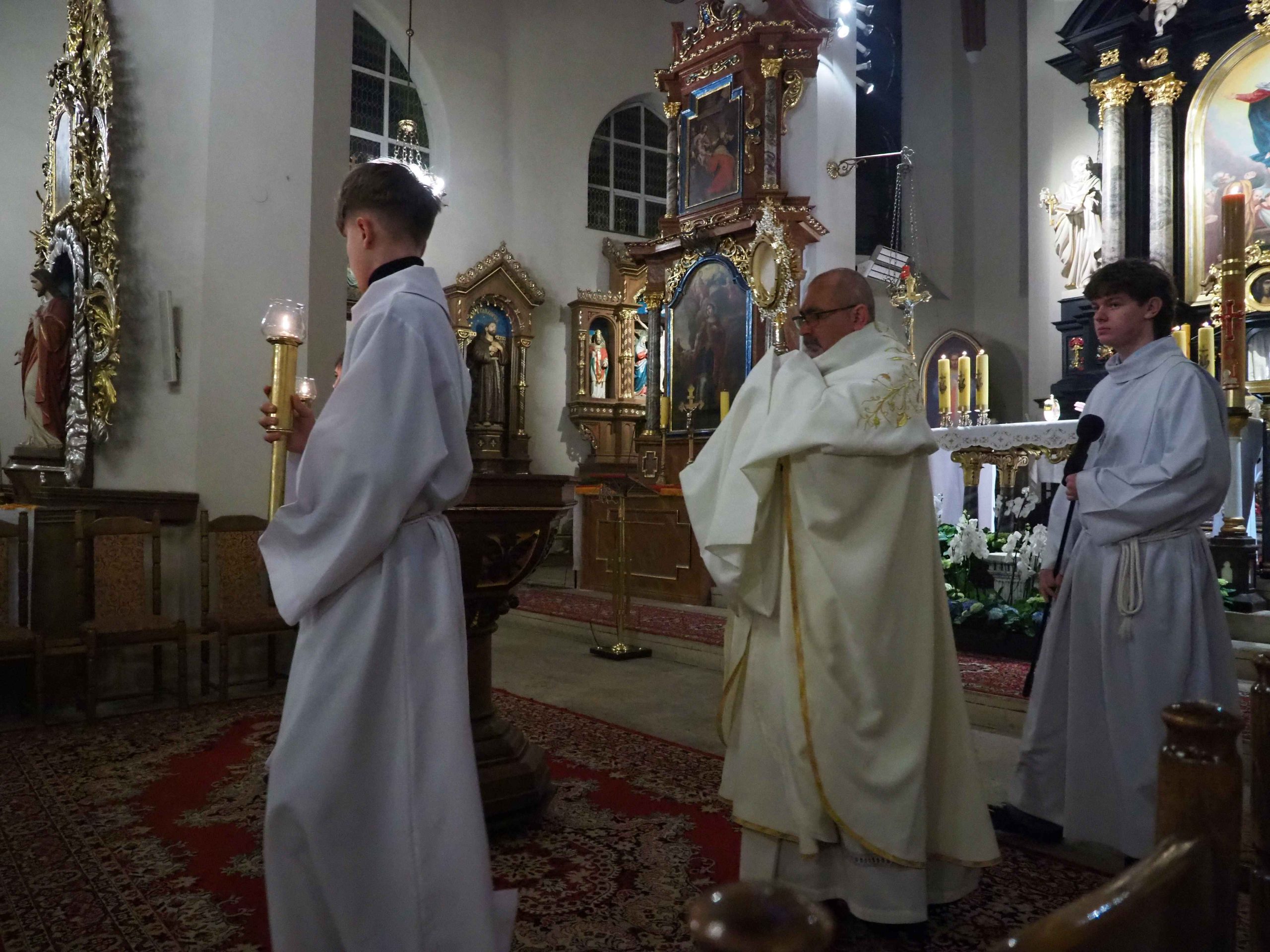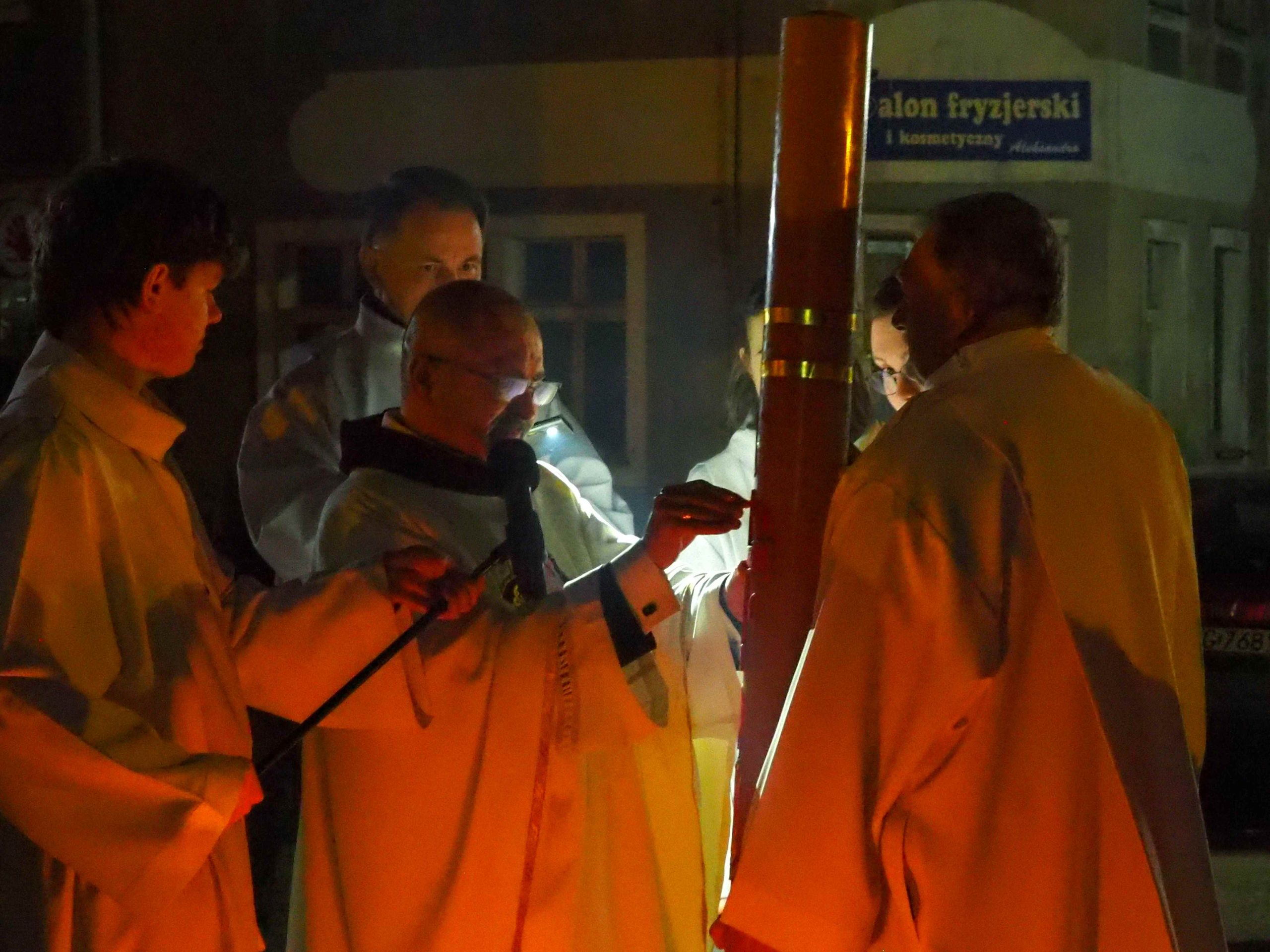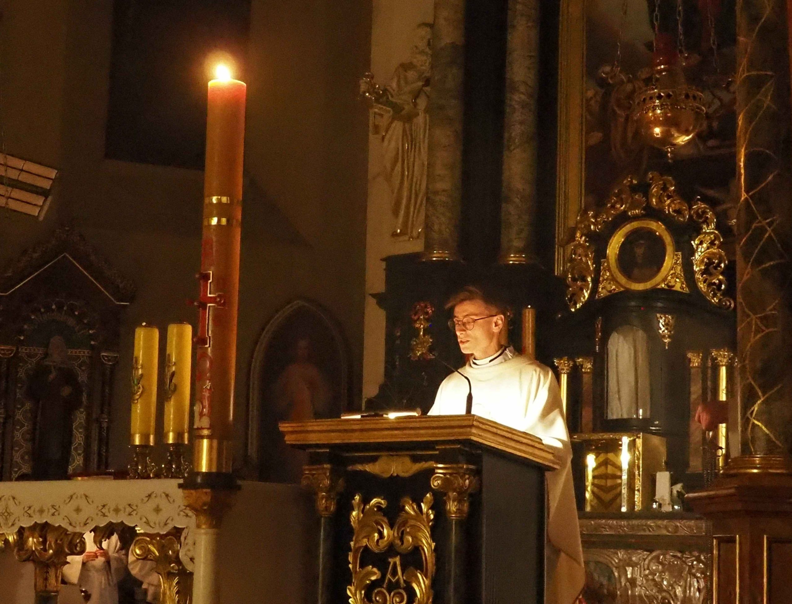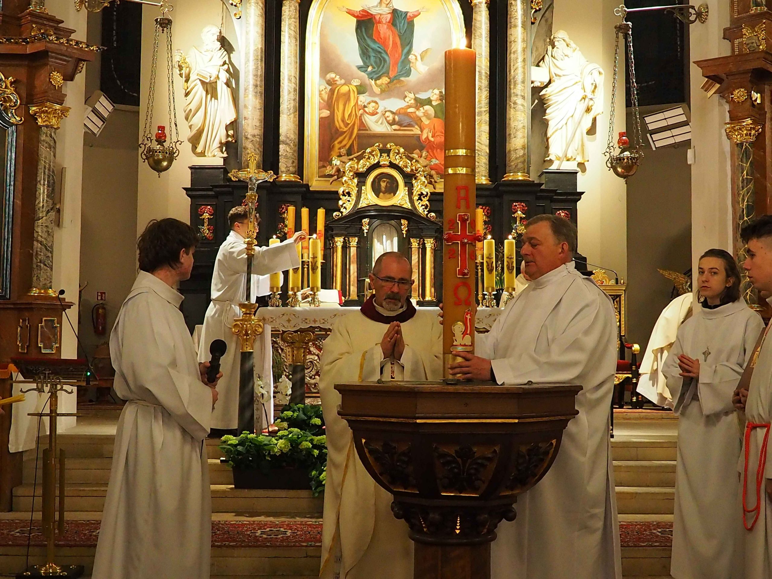 Poświęcony został ogień, od którego zapalił paschał, potem zostały wyżłobione symbolicznie greckie litery Alfa i Omega (Bóg , który istnieje od zawsze i nie przestanie istnieć) oraz cyfry obecnego roku (oznaczają wpisanie naszej, konkretnej historii w nieskończone istnienie Boga) i wbite zostały w paschał symboliczne grona oznaczające 5 ran Chrystusa-Boga. Po zapaleniu paschału celebrans nałożył kadzidło do kadzielnicy. W tym czasie w kościele była zupełna ciemność. Celebrans wchodząc procesyjnie do kościoła trzykrotnie zatrzymywał się śpiewając wezwanie „Światło Chrystusa” i zostawały zapalane świece od paschału. Paschał został wniesiony przed ołtarz i rozpoczęła się liturgia w kościele. Ks. Tomasz odśpiewał ORĘDZIE WIELKANOCNE (Exsultet). Podczas Liturgii Słowa wysłuchaliśmy 8 czytań (7 ze Starego Testamentu i 1 z Nowego Testamentu), przeplatane śpiewem psalmów i modlitwą celebransa. W tę część włączyły się osoby świeckie, nadzwyczajni szafarze i lektorzy. Usłyszeliśmy wreszcie radosne „Chwała na wysokości” wraz z głosami wszystkich dzwonów i dzwonków.