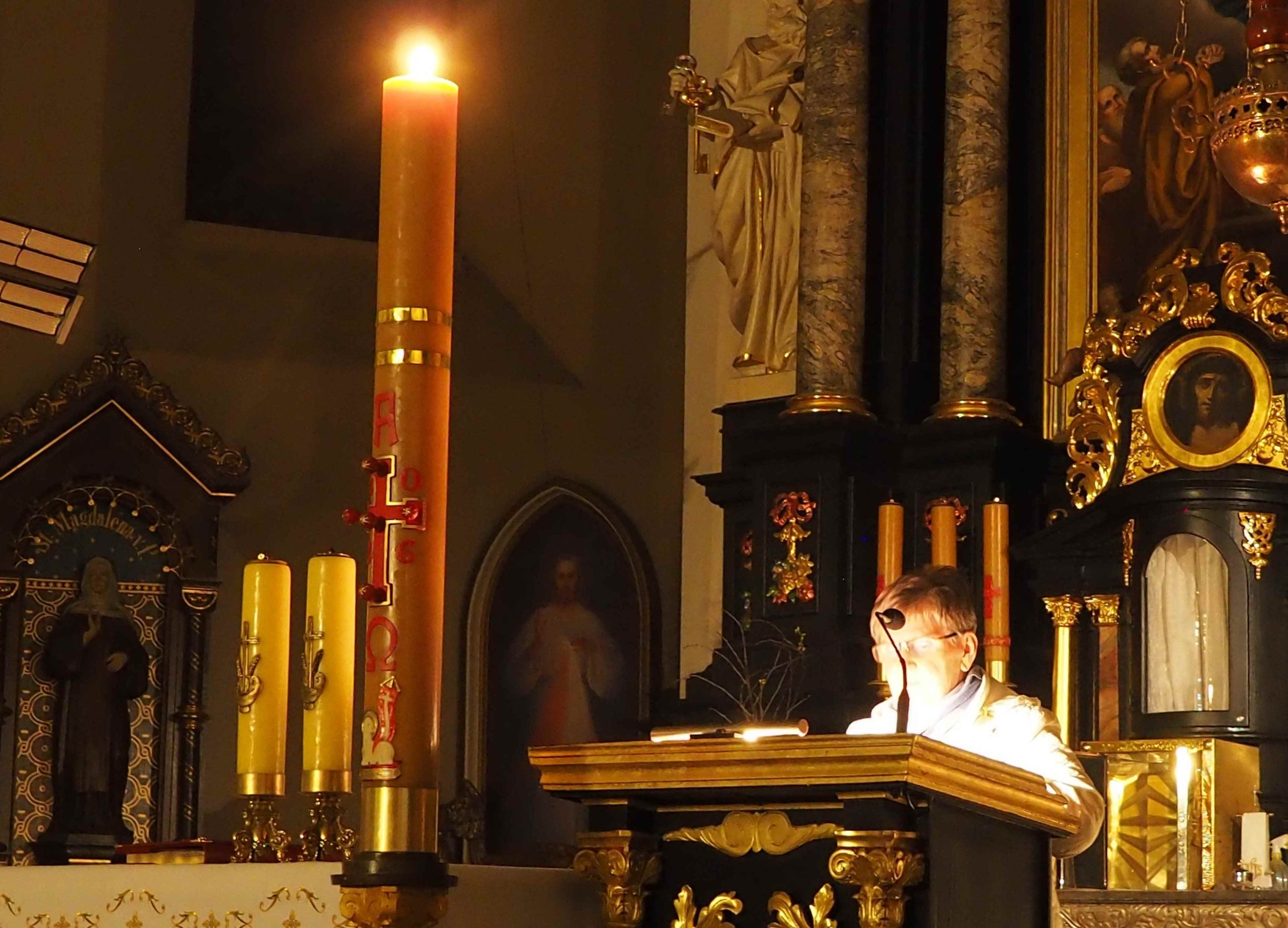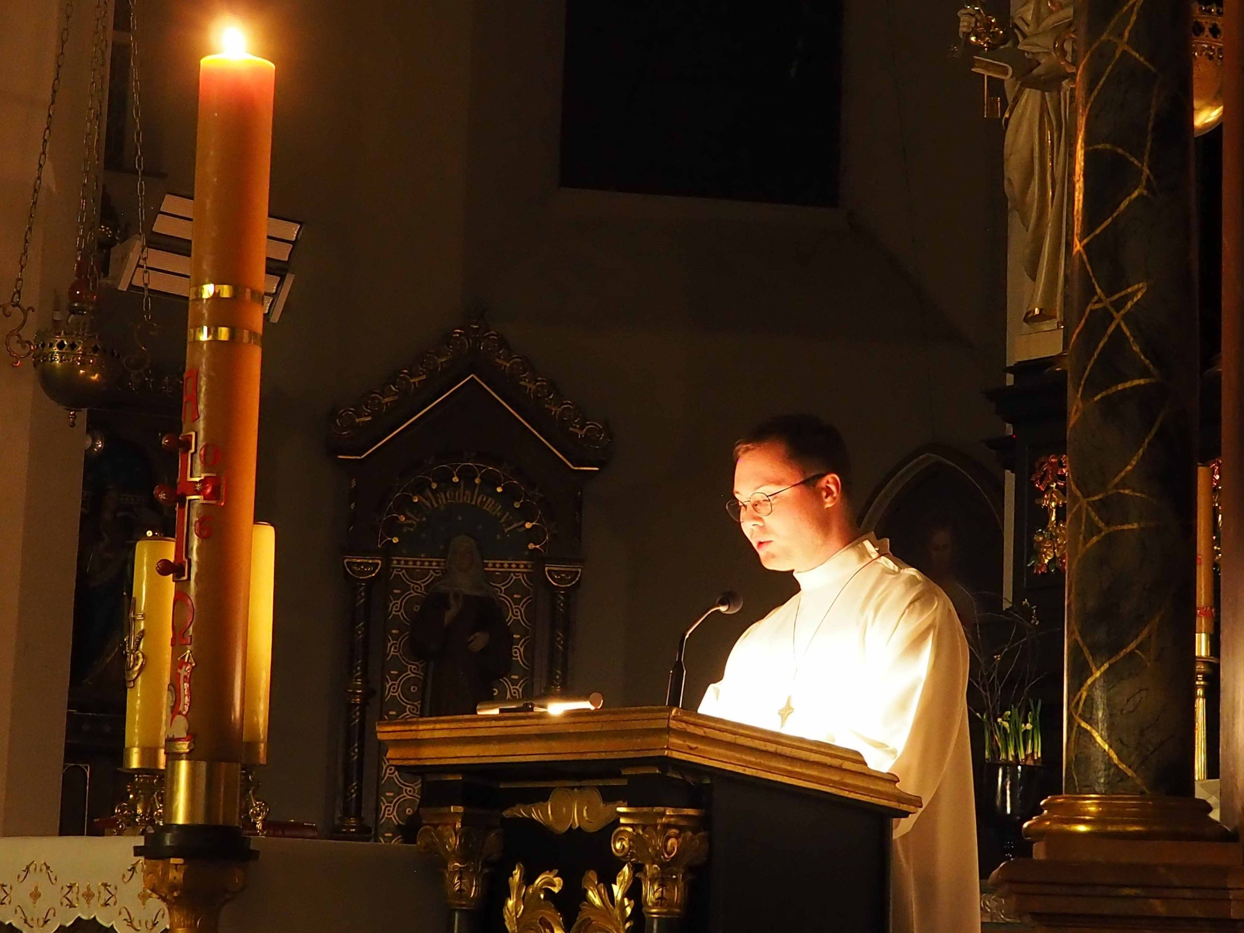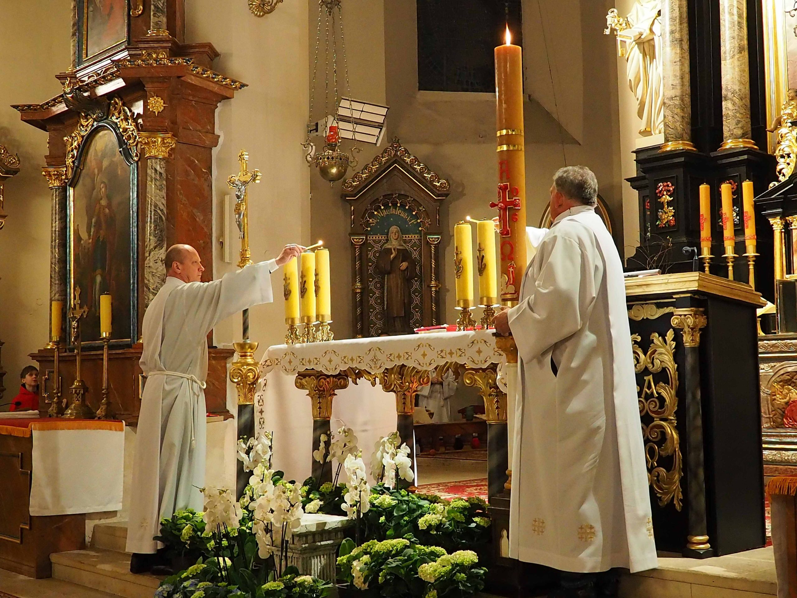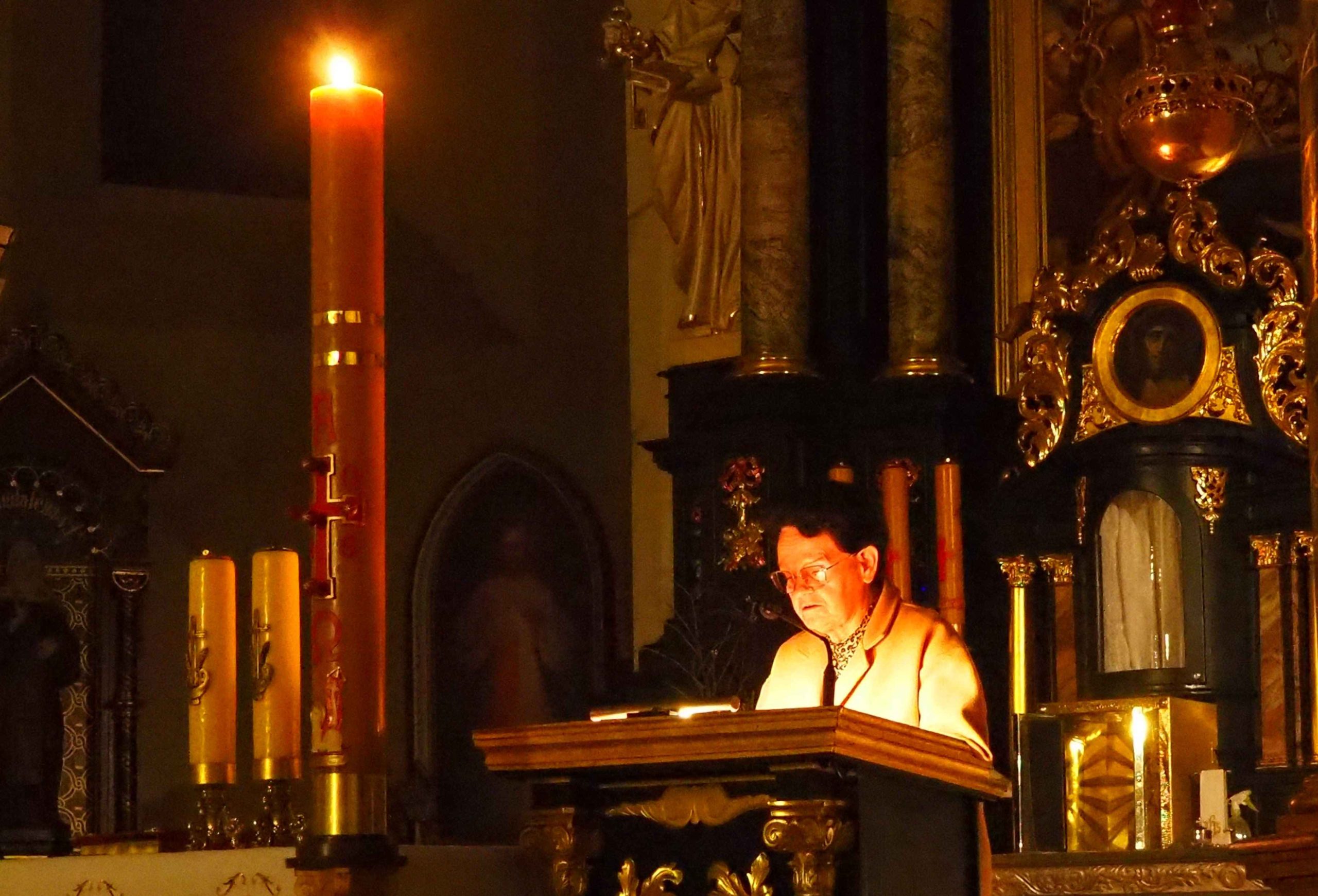 Poświęcony został ogień, od którego zapalił paschał, potem zostały wyżłobione symbolicznie greckie litery Alfa i Omega (Bóg , który istnieje od zawsze i nie przestanie istnieć) oraz cyfry obecnego roku (oznaczają wpisanie naszej, konkretnej historii w nieskończone istnienie Boga) i wbite zostały w paschał symboliczne grona oznaczające 5 ran Chrystusa-Boga. Po zapaleniu paschału celebrans nałożył kadzidło do kadzielnicy. W tym czasie w kościele była zupełna ciemność. Celebrans wchodząc procesyjnie do kościoła trzykrotnie zatrzymywał się śpiewając wezwanie „Światło Chrystusa” i zostawały zapalane świece od paschału. Paschał został wniesiony przed ołtarz i rozpoczęła się liturgia w kościele. Ks. Tomasz odśpiewał ORĘDZIE WIELKANOCNE (Exsultet). Podczas Liturgii Słowa wysłuchaliśmy 8 czytań (7 ze Starego Testamentu i 1 z Nowego Testamentu), przeplatane śpiewem psalmów i modlitwą celebransa. W tę część włączyły się osoby świeckie, nadzwyczajni szafarze i lektorzy. Usłyszeliśmy wreszcie radosne „Chwała na wysokości” wraz z głosami wszystkich dzwonów i dzwonków.