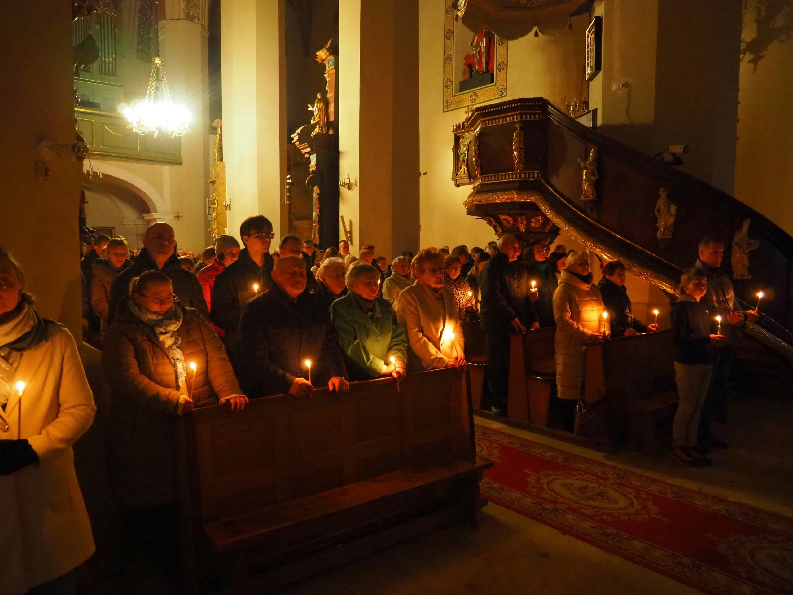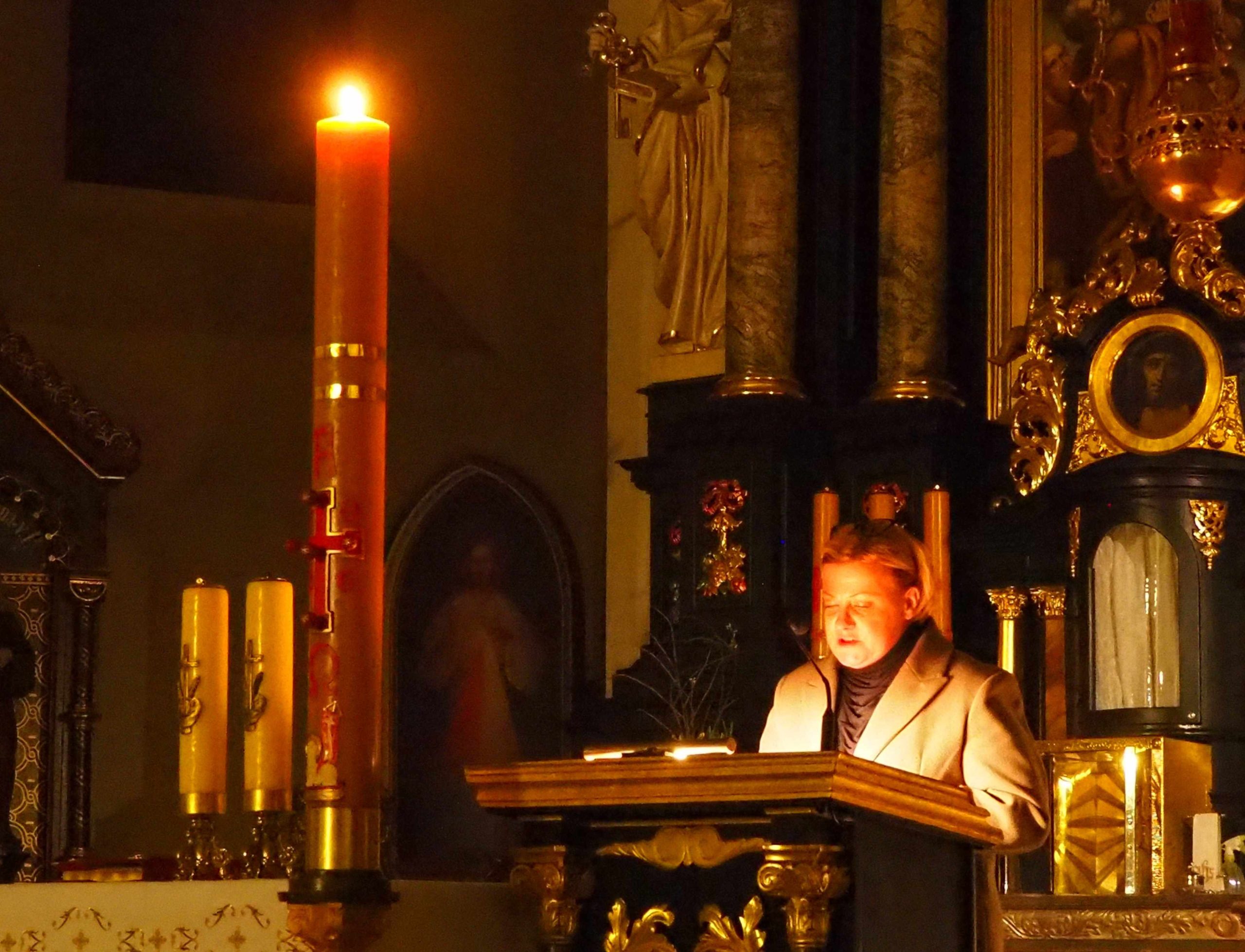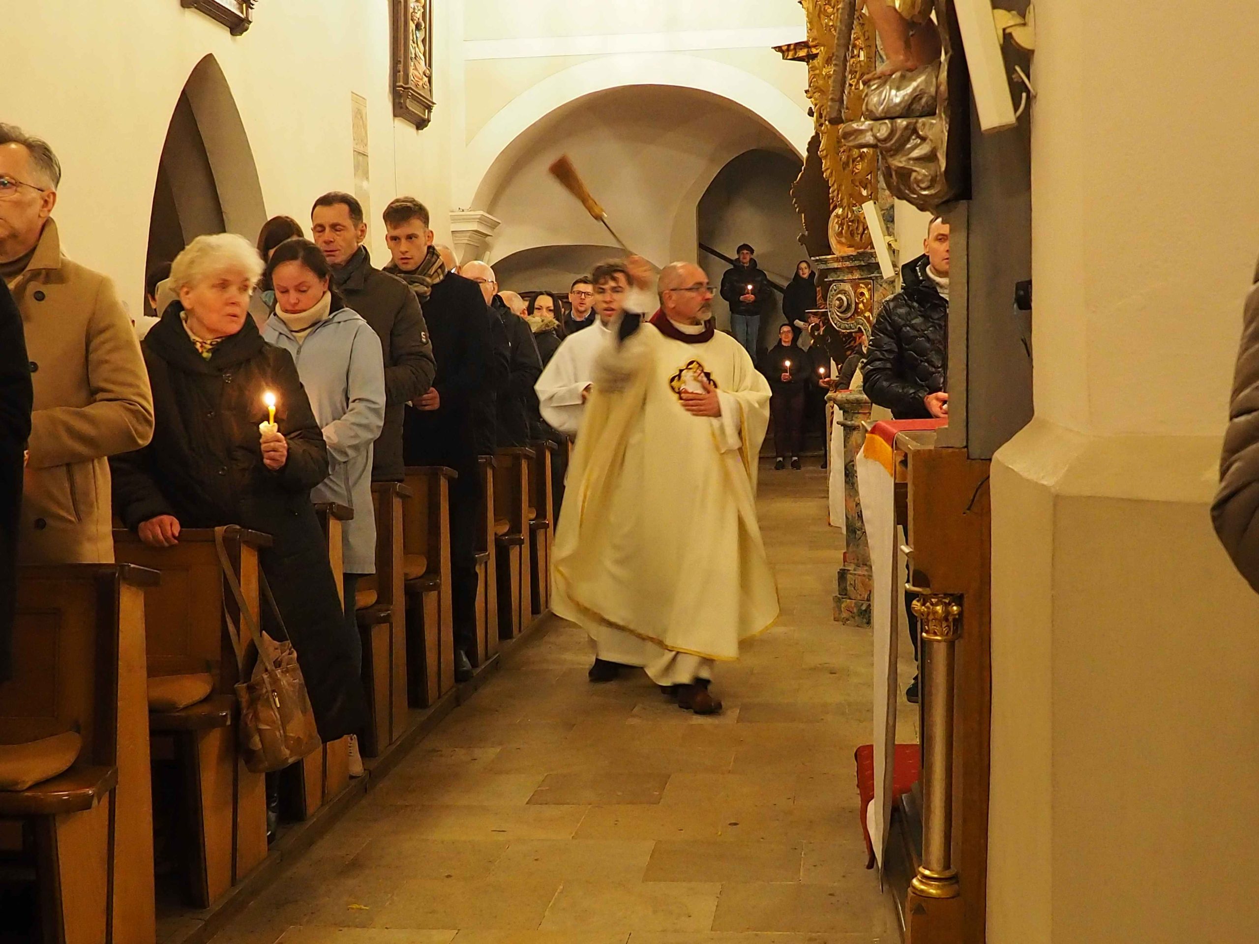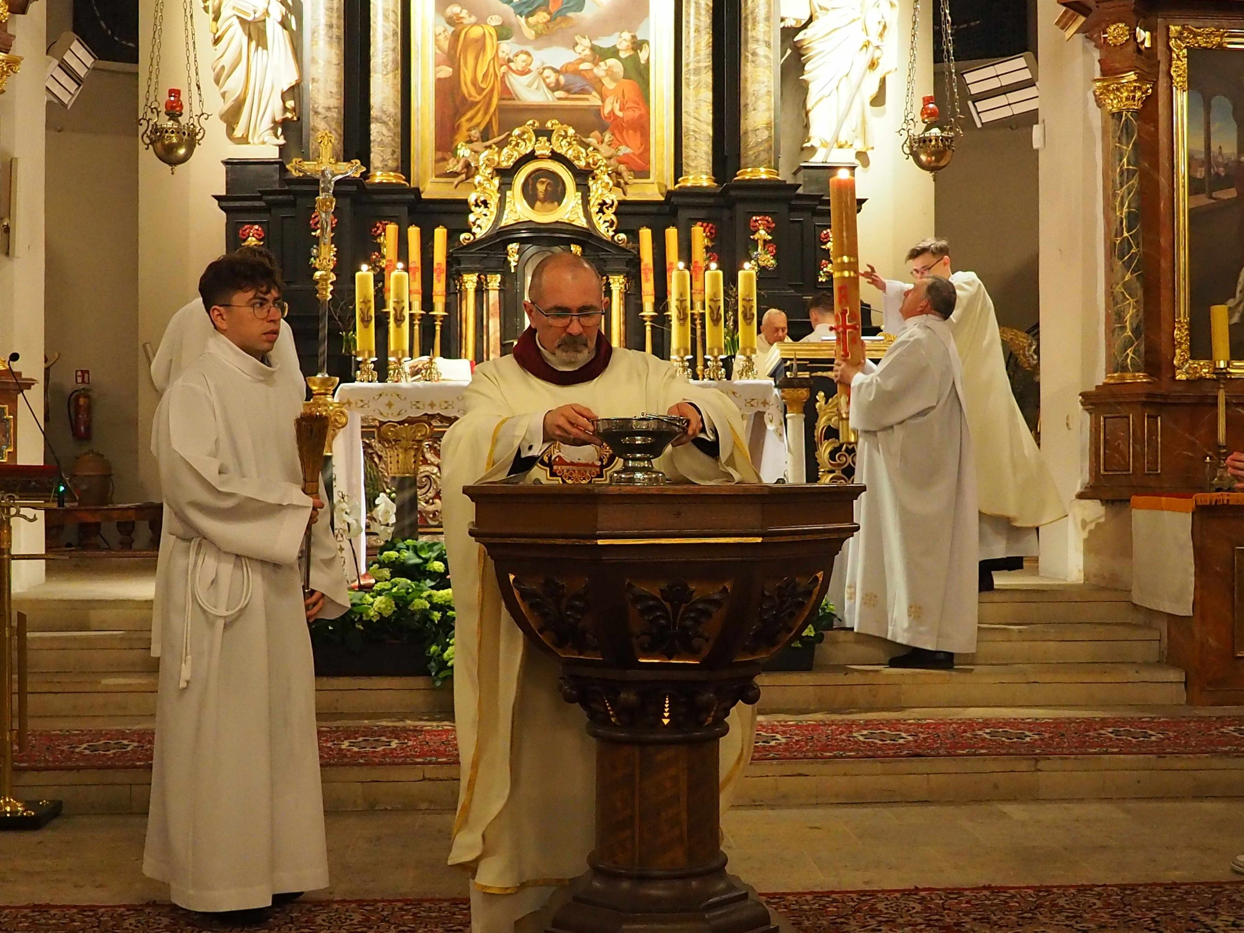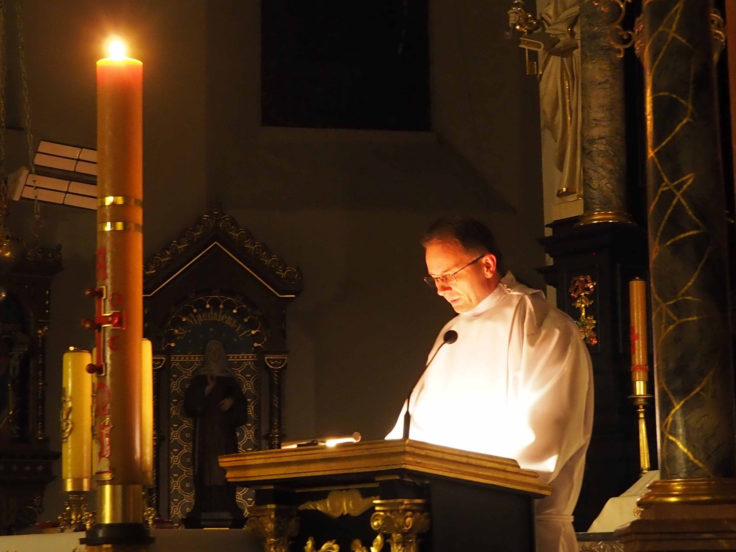 Poświęcony został ogień, od którego zapalił paschał, potem zostały wyżłobione symbolicznie greckie litery Alfa i Omega (Bóg , który istnieje od zawsze i nie przestanie istnieć) oraz cyfry obecnego roku (oznaczają wpisanie naszej, konkretnej historii w nieskończone istnienie Boga) i wbite zostały w paschał symboliczne grona oznaczające 5 ran Chrystusa-Boga. Po zapaleniu paschału celebrans nałożył kadzidło do kadzielnicy. W tym czasie w kościele była zupełna ciemność. Celebrans wchodząc procesyjnie do kościoła trzykrotnie zatrzymywał się śpiewając wezwanie „Światło Chrystusa” i zostawały zapalane świece od paschału. Paschał został wniesiony przed ołtarz i rozpoczęła się liturgia w kościele. Ks. Tomasz odśpiewał ORĘDZIE WIELKANOCNE (Exsultet). Podczas Liturgii Słowa wysłuchaliśmy 8 czytań (7 ze Starego Testamentu i 1 z Nowego Testamentu), przeplatane śpiewem psalmów i modlitwą celebransa. W tę część włączyły się osoby świeckie, nadzwyczajni szafarze i lektorzy. Usłyszeliśmy wreszcie radosne „Chwała na wysokości” wraz z głosami wszystkich dzwonów i dzwonków.