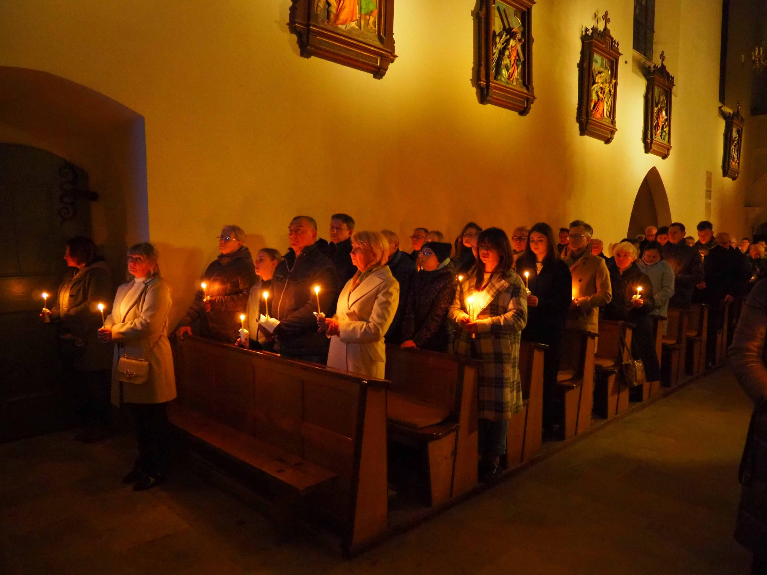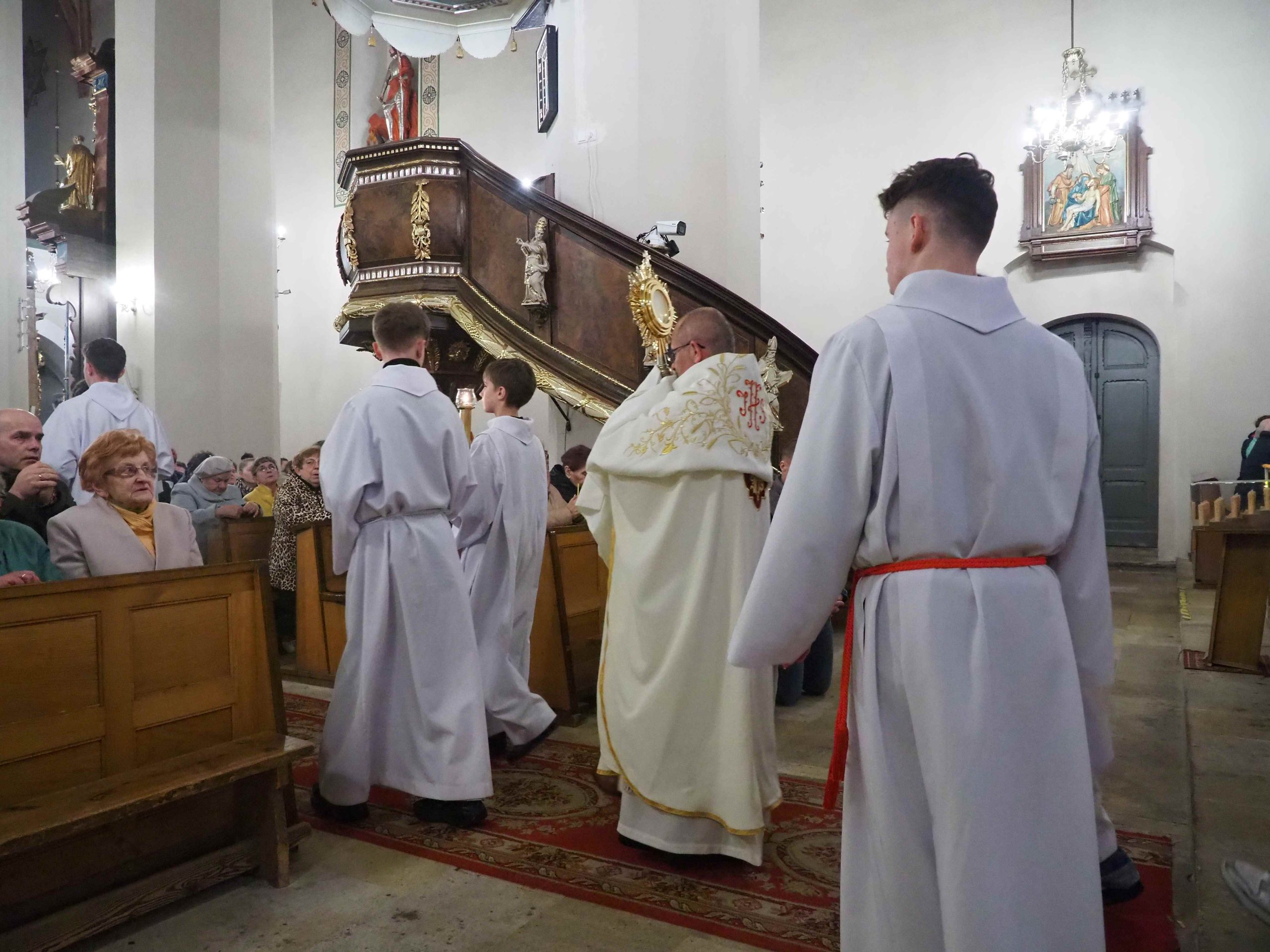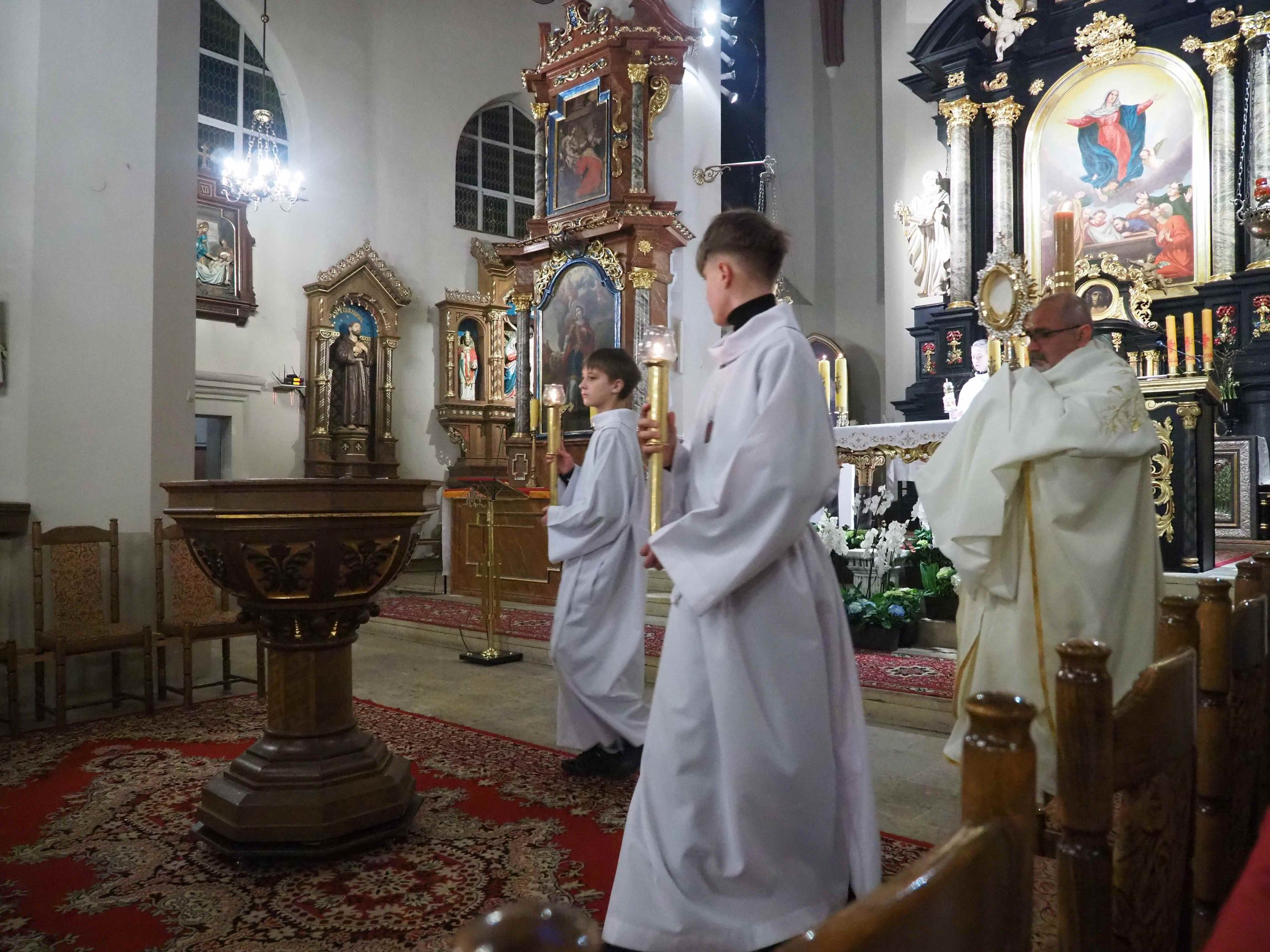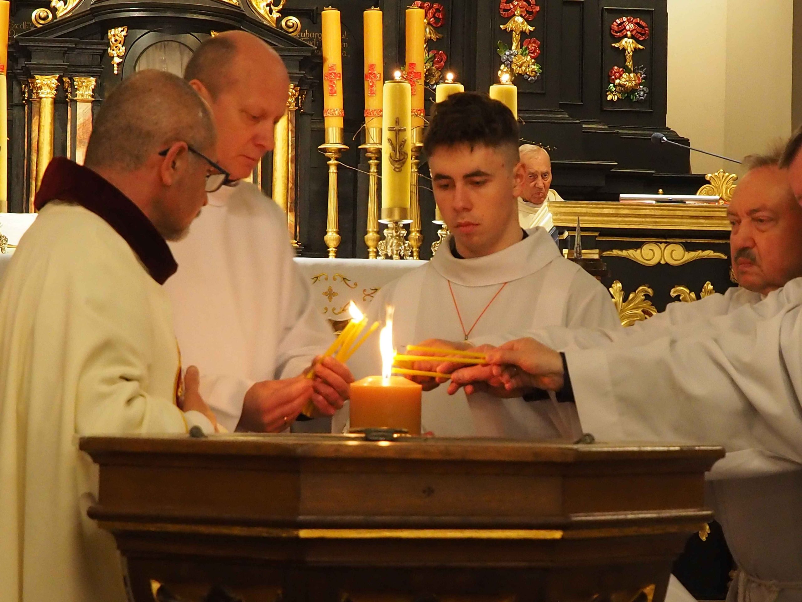 Poświęcony został ogień, od którego zapalił paschał, potem zostały wyżłobione symbolicznie greckie litery Alfa i Omega (Bóg , który istnieje od zawsze i nie przestanie istnieć) oraz cyfry obecnego roku (oznaczają wpisanie naszej, konkretnej historii w nieskończone istnienie Boga) i wbite zostały w paschał symboliczne grona oznaczające 5 ran Chrystusa-Boga. Po zapaleniu paschału celebrans nałożył kadzidło do kadzielnicy. W tym czasie w kościele była zupełna ciemność. Celebrans wchodząc procesyjnie do kościoła trzykrotnie zatrzymywał się śpiewając wezwanie „Światło Chrystusa” i zostawały zapalane świece od paschału. Paschał został wniesiony przed ołtarz i rozpoczęła się liturgia w kościele. Ks. Tomasz odśpiewał ORĘDZIE WIELKANOCNE (Exsultet). Podczas Liturgii Słowa wysłuchaliśmy 8 czytań (7 ze Starego Testamentu i 1 z Nowego Testamentu), przeplatane śpiewem psalmów i modlitwą celebransa. W tę część włączyły się osoby świeckie, nadzwyczajni szafarze i lektorzy. Usłyszeliśmy wreszcie radosne „Chwała na wysokości” wraz z głosami wszystkich dzwonów i dzwonków.