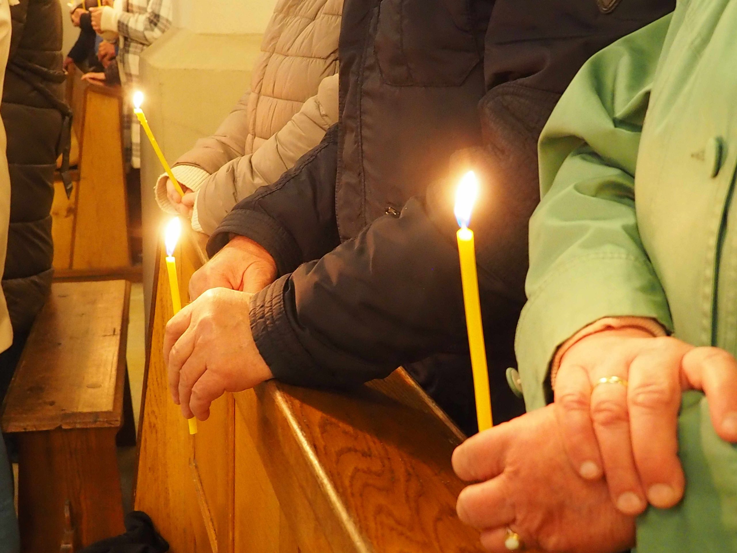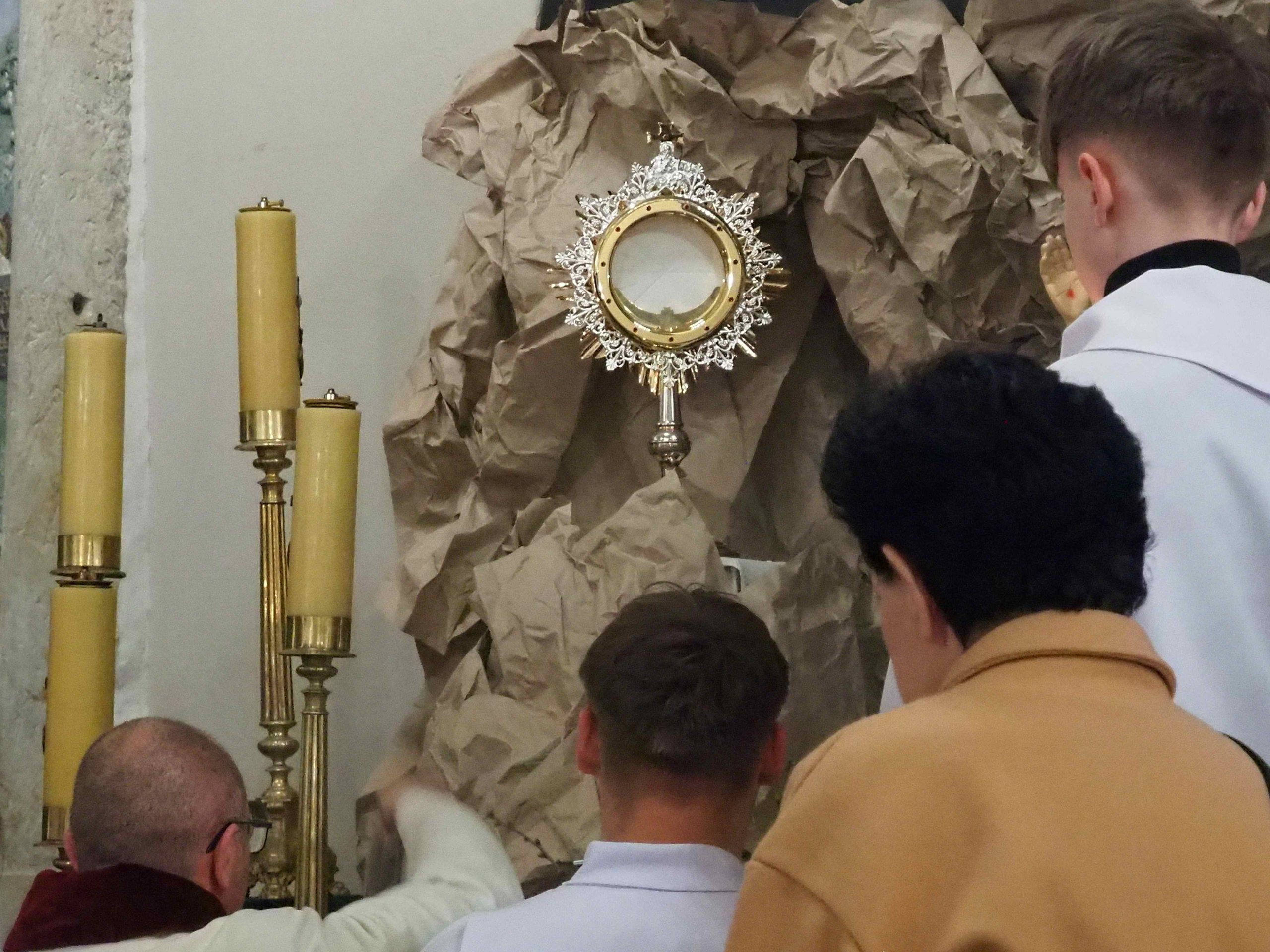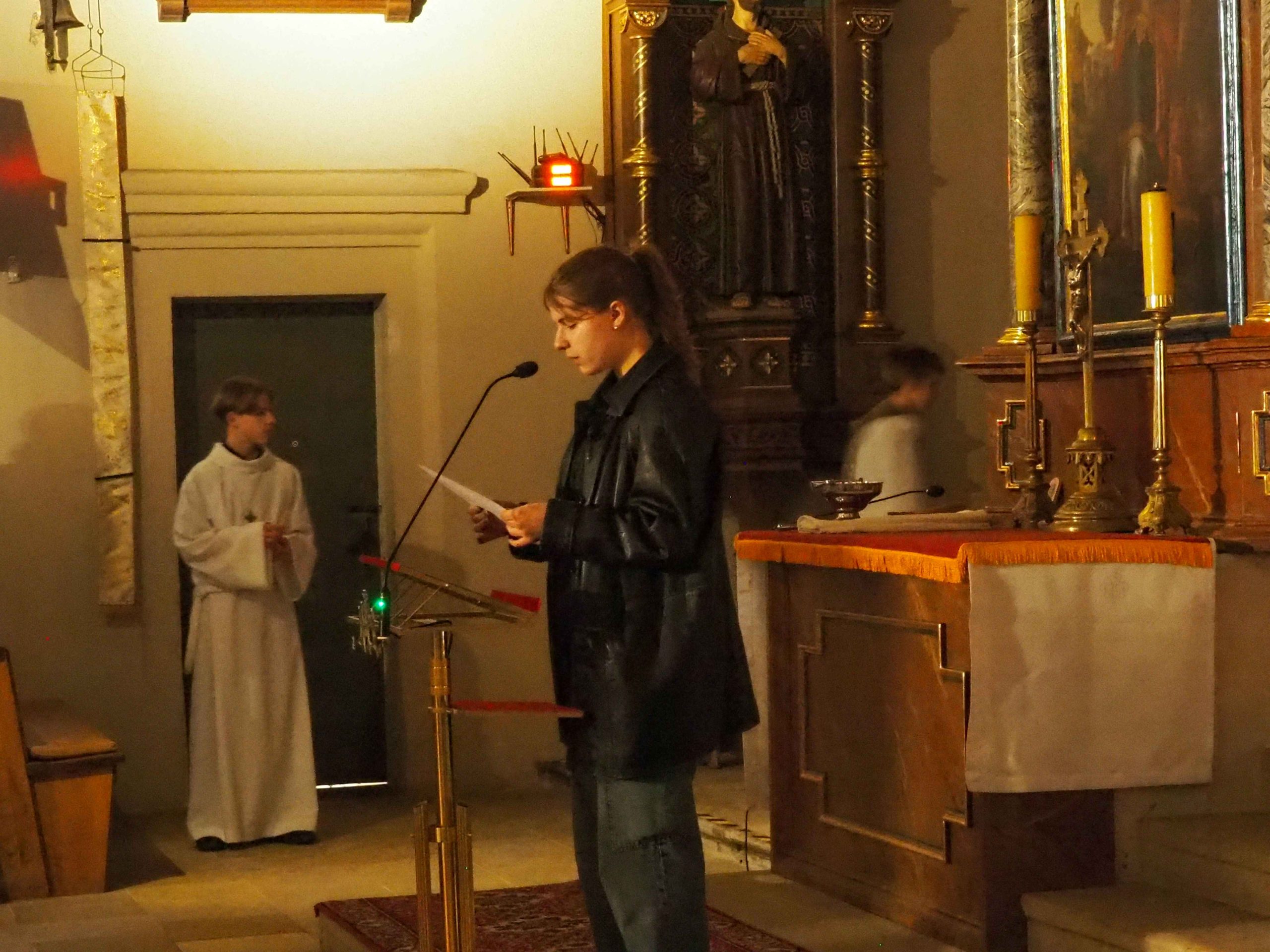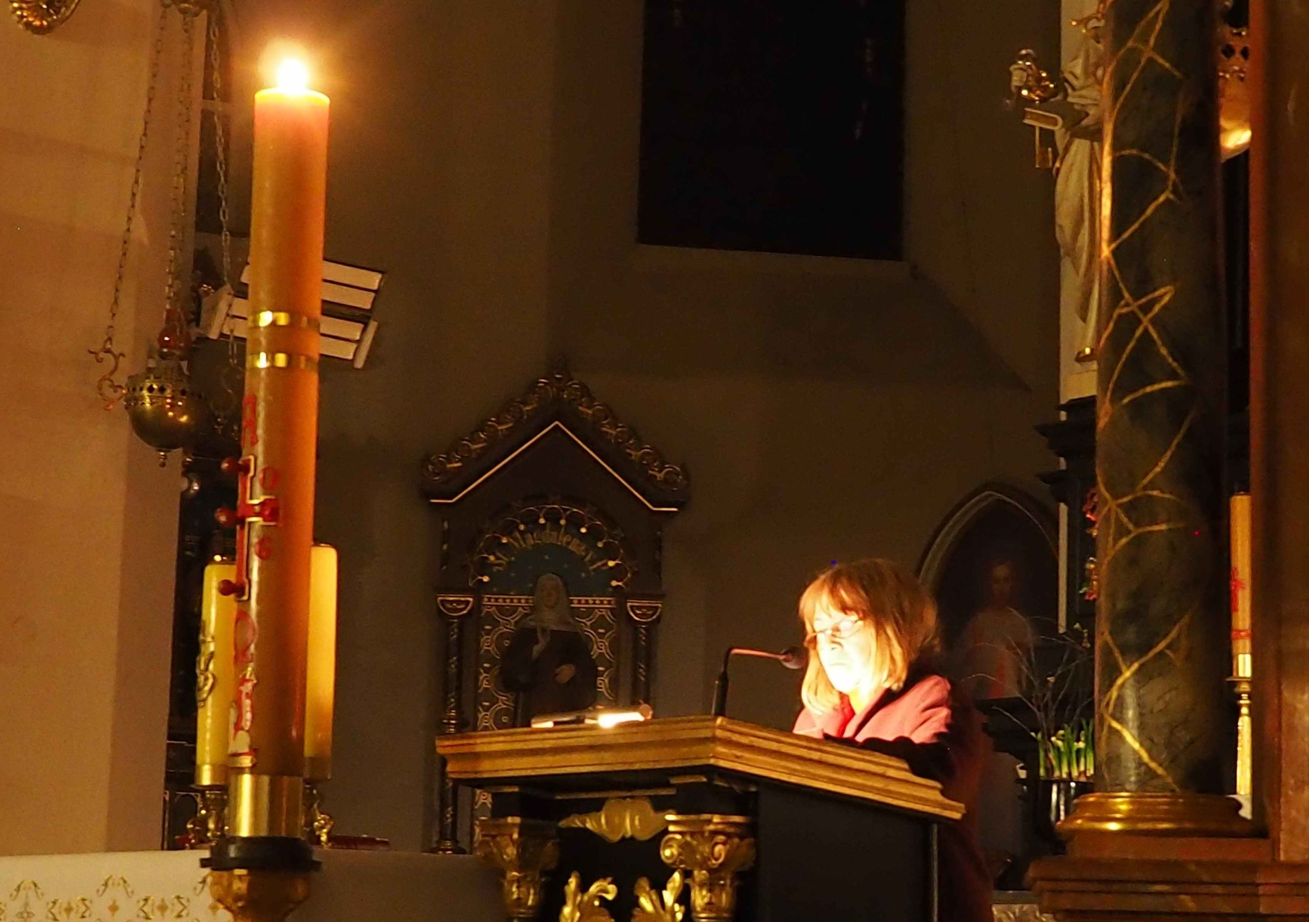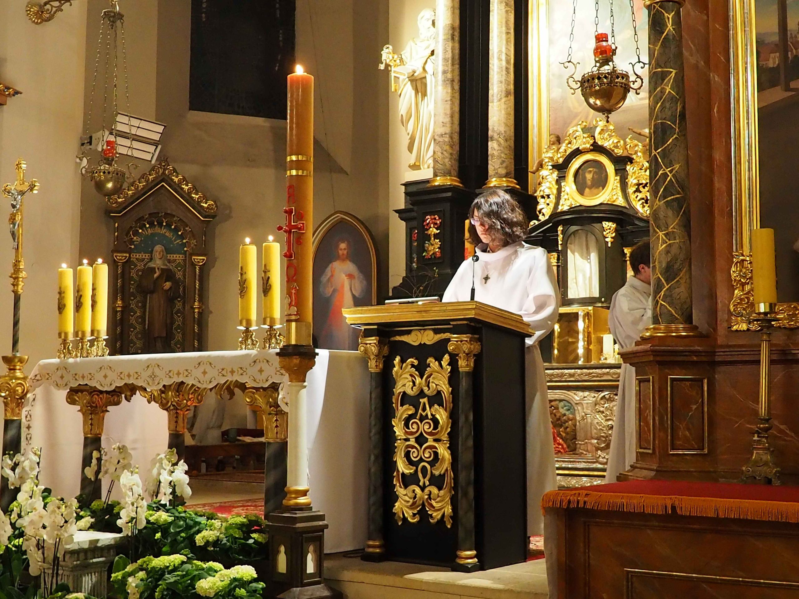 Poświęcony został ogień, od którego zapalił paschał, potem zostały wyżłobione symbolicznie greckie litery Alfa i Omega (Bóg , który istnieje od zawsze i nie przestanie istnieć) oraz cyfry obecnego roku (oznaczają wpisanie naszej, konkretnej historii w nieskończone istnienie Boga) i wbite zostały w paschał symboliczne grona oznaczające 5 ran Chrystusa-Boga. Po zapaleniu paschału celebrans nałożył kadzidło do kadzielnicy. W tym czasie w kościele była zupełna ciemność. Celebrans wchodząc procesyjnie do kościoła trzykrotnie zatrzymywał się śpiewając wezwanie „Światło Chrystusa” i zostawały zapalane świece od paschału. Paschał został wniesiony przed ołtarz i rozpoczęła się liturgia w kościele. Ks. Tomasz odśpiewał ORĘDZIE WIELKANOCNE (Exsultet). Podczas Liturgii Słowa wysłuchaliśmy 8 czytań (7 ze Starego Testamentu i 1 z Nowego Testamentu), przeplatane śpiewem psalmów i modlitwą celebransa. W tę część włączyły się osoby świeckie, nadzwyczajni szafarze i lektorzy. Usłyszeliśmy wreszcie radosne „Chwała na wysokości” wraz z głosami wszystkich dzwonów i dzwonków.