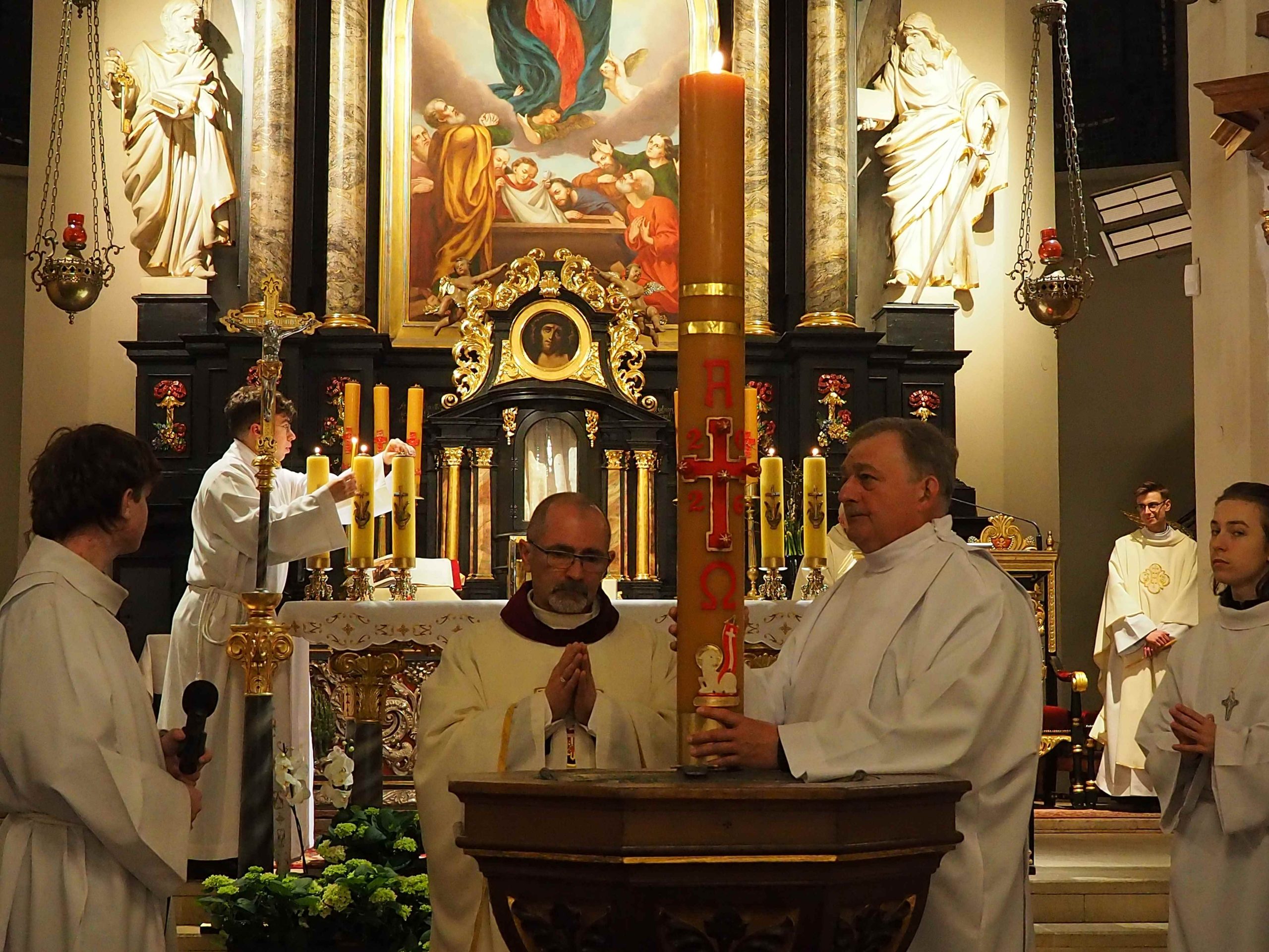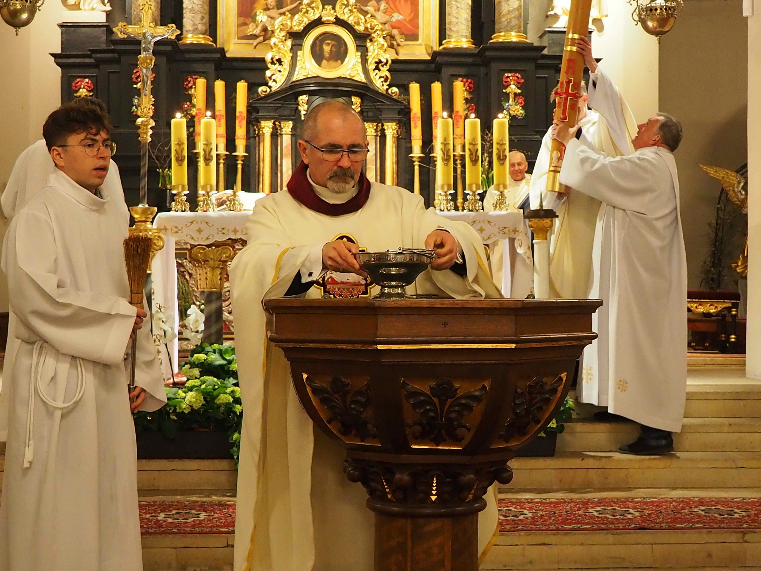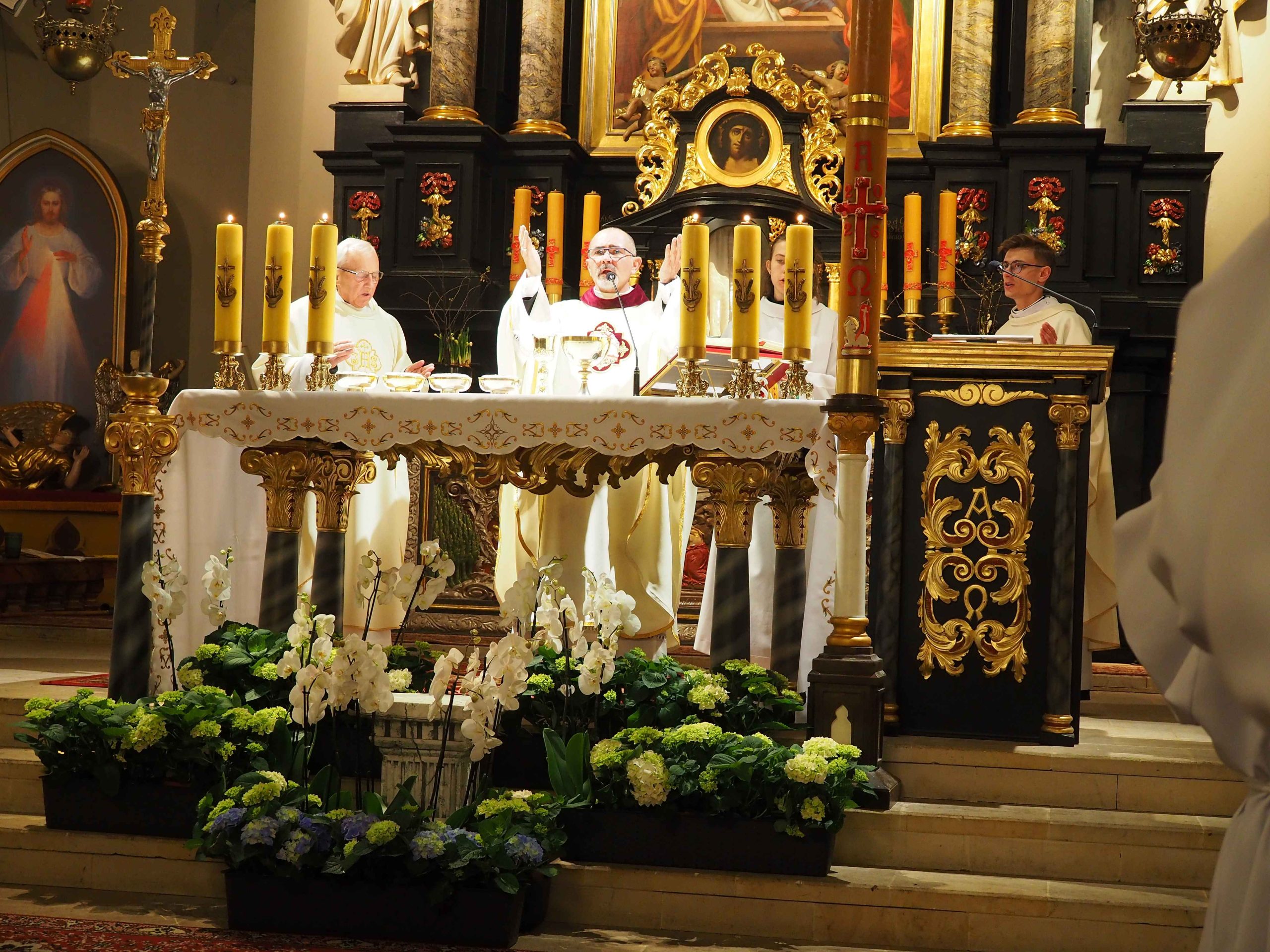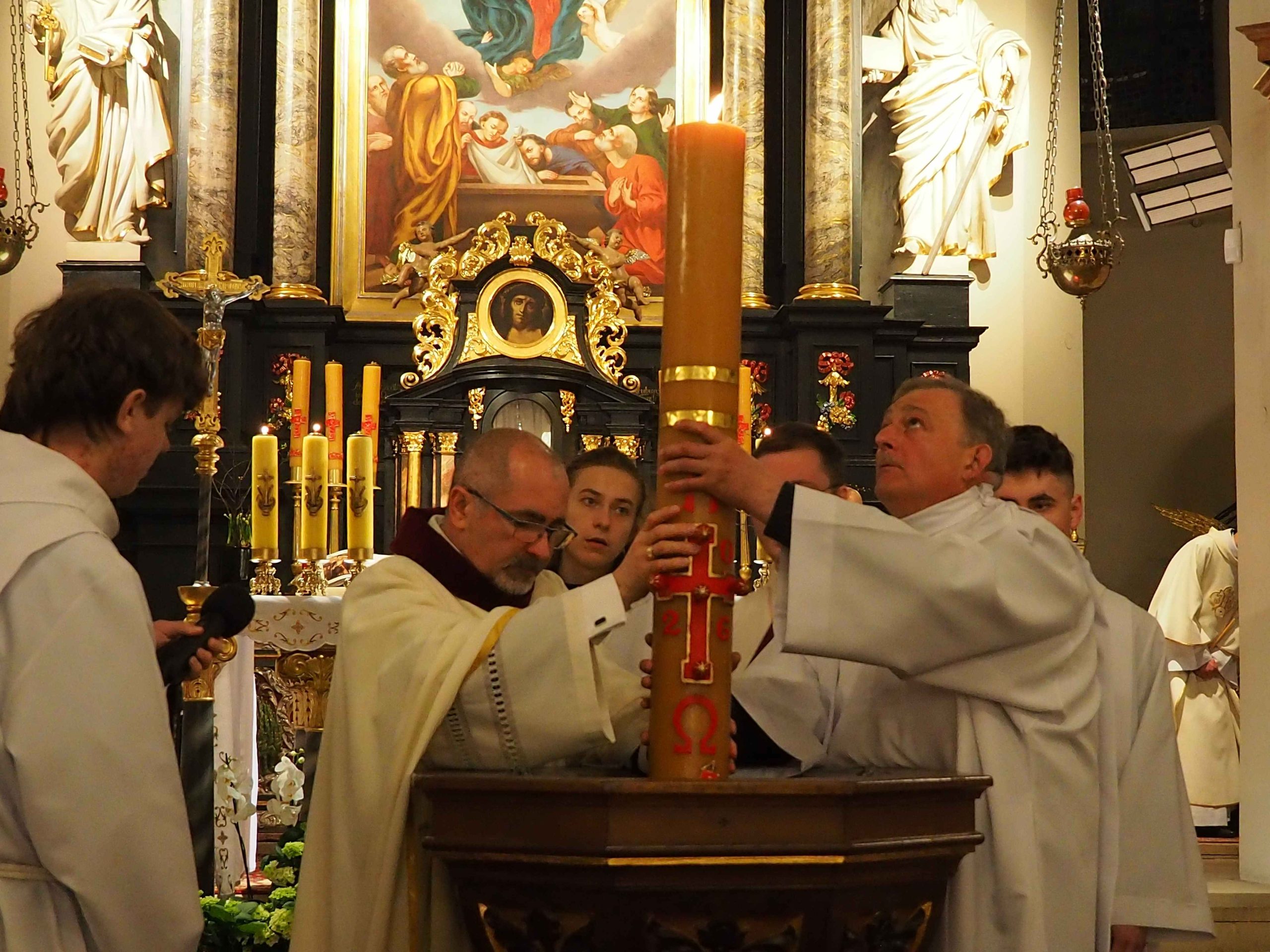 4 kwietnia 2026 roku o godz. 21:00 rozpoczęła się LITURGIA PASCHALNA oznajmiająca nam Zmartwychwstanie Chrystusa została odprawiona kościele WNMP i św. Andrzeja Apostoła. Liturgia rozpoczęła się przed kościołem gdzie został poświęcony ogień. Liturgię w kościele WNMP koncelebrowali: ks. kan. Dominik, ks. Prałat Ryszard i ks. Tomasz. Głównym celebransem był ks. Dominik. W kościele św. Andrzeja Apostoła celebrował ks. Krzysztof.