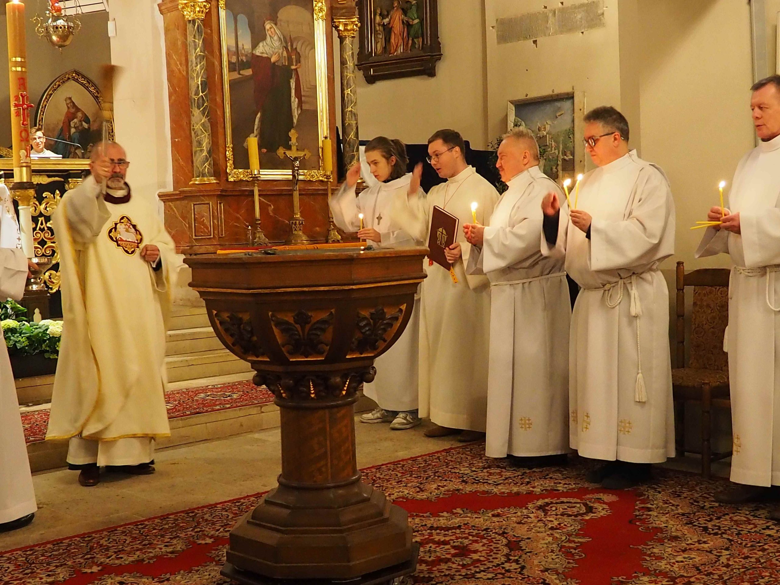 Następną częścią liturgii było poświęcenie wody i odnowienie przyrzeczeń Chrztu św. Ceremonię poprzedzało odśpiewanie Litanii do Wszystkich Świętych. Na zakończenie Eucharystii wszyscy w procesji z Najświętszym Sakramentem wyruszyli wokół kościoła oznajmiając wszystkim, że Chrystus Zmartwychwstał. Przed rozesłaniem odśpiewaliśmy uroczyste Te Deum.