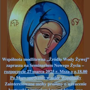 Wspólnota Źródło Wody Żywej zaprasza na Seminaria Nowego Życia. Rozpoczęcie w piątek 27 marca 2026 roku po Mszy Świętej wieczornej o godz. 1800 w salce wspólnoty. Zainteresowane