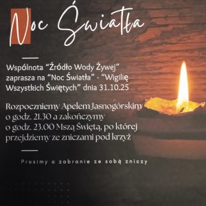 W Wigilię Wszystkich Świętych 31 października 2025 roku (piątek) odbędzie się „NOC ŚWIATŁA”. Rozpocznie się o godz. 21:30 Apelem Jasnogórskim, a zakończy się Mszą Św.