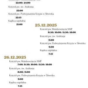 W poniedziałek 8 grudnia 2025 przypada uroczystość Niepokalanego Poczęcia NMP. W tym uroczystym dniu Msze św. odprawione zostały o godz. 7:00; 9:00; i 18:00. Godzina
